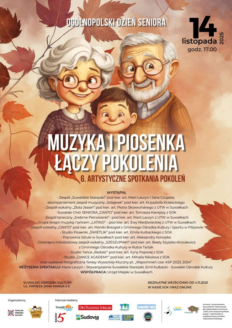 Suwalski Ośrodek Kultury zaprasza w piątek 14. listopada na koncert z okazji Ogólnopolskiego Dnia Seniora. Muzyka i piosenka łączy pokolenia – 6. ARTYSTYCZNE SPOTKANIA POKOLEŃ.