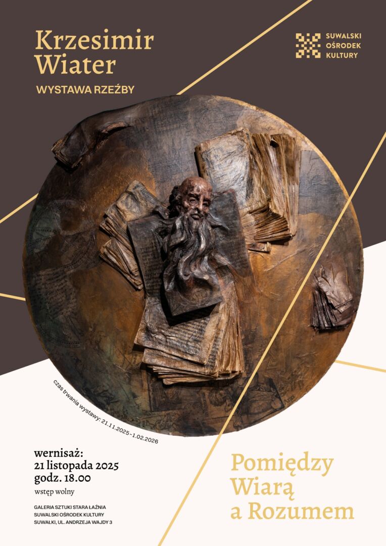 Suwalski Ośrodek Kultury zaprasza w piątek (21.11) na uroczysty wernisaż wystawy „Pomiędzy Wiarą a Rozumem”. Swoje rzeźby zaprezentuje krakowski artysta Krzesimir Wiater, znany z oryginalnych realizacji balansujących między refleksją filozoficzną a wrażliwością formy.