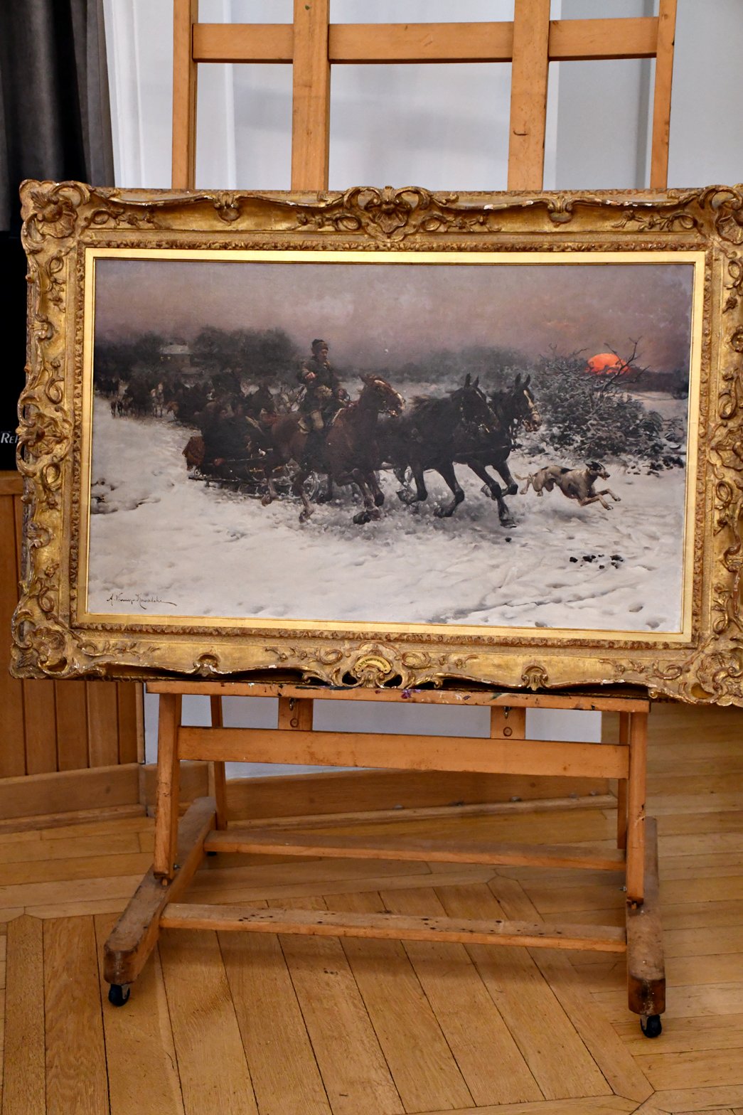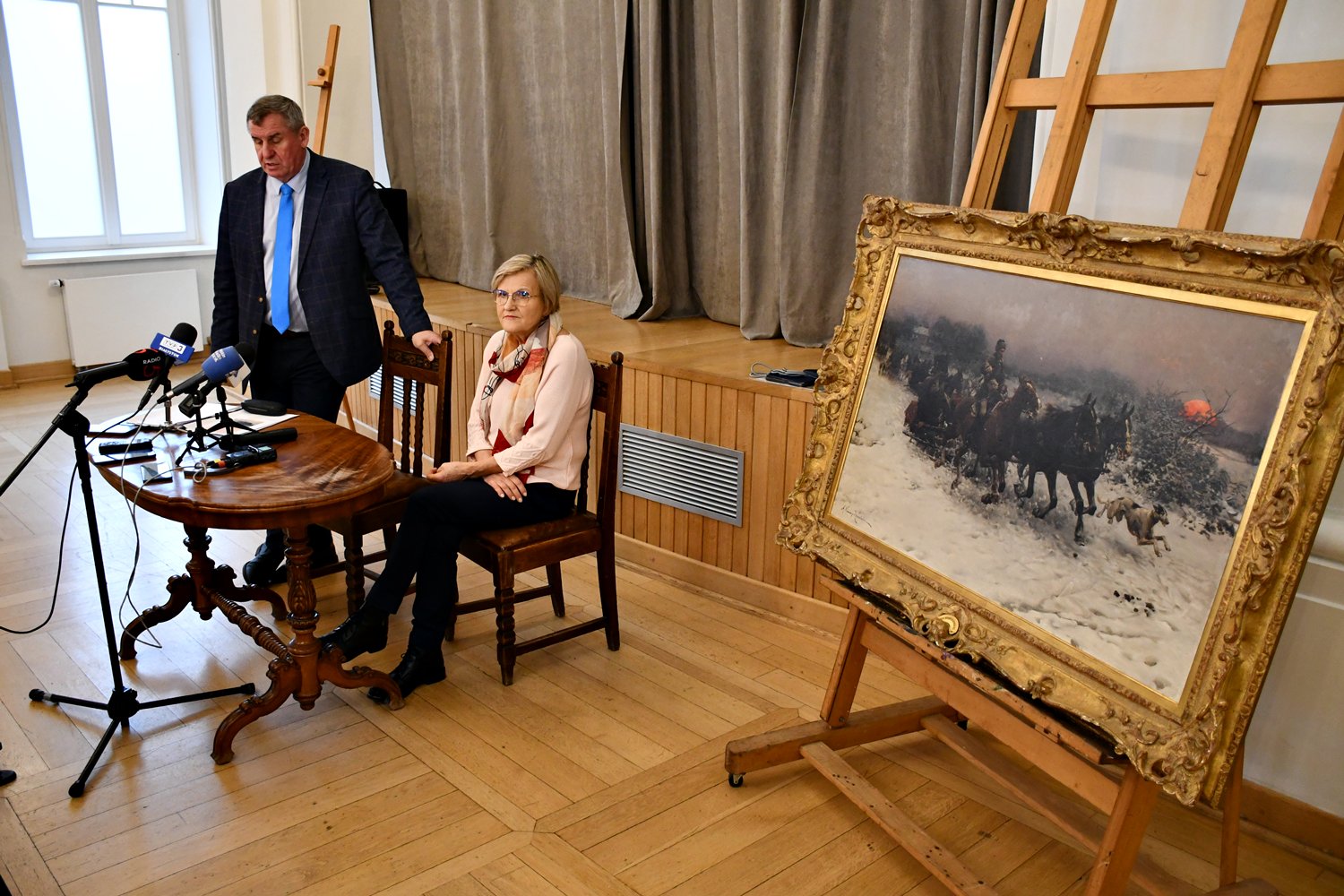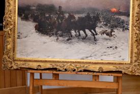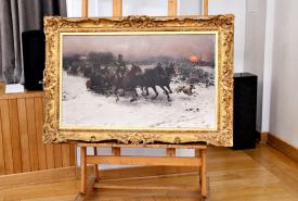 - Nie wiemy, jakie były jego losy — czy wędrował od kolekcjonera do kolekcjonera, czy może przez cały czas pozostawał w jednym miejscu, w jednej rodzinie. W każdym razie w latach dwudziestych trafił do Polski, właśnie do kolekcjonera, który zakupił go w domu aukcyjnym. Ten obraz z jednej strony jest znany, ponieważ był reprodukowany w publikacji wydanej w latach 90. w Niemczech i oczywiście ukazał się także w katalogu aukcji w Polskim Salonie Sztuki. Natomiast nigdy nie był reprodukowany w prasie, co potwierdza tezę, że musiał zostać sprzedany bezpośrednio z pracowni i nie doczekał się innych wersji. To znaczy — istnieje obraz zbliżony tematycznie, przedstawiający kulig wyjeżdżający gdzieś w przestrzeń, zostawiający za sobą wieś lub, jak tutaj, dwór — jednak jest to jeden, jedyny obraz. A jak wiemy, Wierusz lubił wracać do motywów, które zyskały popularność lub spodobały się odbiorcom sztuki, miłośnikom, a także tym, które były prezentowane na wystawach. Lubił je powtarzać, oczywiście przearanżowując wiele elementów. Dzięki temu zawsze zachowywały świeży, nowy wygląd — nie było w nich poczucia powtórzenia. Ten obraz natomiast jest jak gdyby jedyny, co podnosi jego rangę i znaczenie. Jest to dzieło, które powstało w latach 80., uznawanych za najlepszy okres w jego twórczości. Choć później stworzył wiele bardzo pięknych i wyjątkowych obrazów, to właśnie ten czas — od lat 80. do połowy lat 90. — uchodzi za okres szczytowy w jego dorobku artystycznym. Być może dlatego, że najbardziej trafiał wówczas do odbiorców, chociażby poprzez bardzo wierne odtworzenie przedstawianej rzeczywistości. Często słyszy się reakcje w rodzaju: „och, jak pięknie — jak na fotografii”, że wszystko wygląda niemal fotograficznie. Rzeczywiście były to obrazy, które epatowały i urzekały swoją nastrojowością oraz szczególnym urokiem świata, który już minął. Był to świat, który także w tamtym czasie — a z pewnością dla odbiorców zachodnioeuropejskich czy amerykańskich — jawił się jako egzotyczny, nieznany im z codziennego doświadczenia. Odmienność strojów, a także w pewnym stopniu krajobrazu, dodatkowo potęgowała to poczucie egzotyki. Dlatego dla nas ten obraz będzie jednym z czołowych dzieł w naszej kolekcji - przekazała Eliza Ptaszyńska.