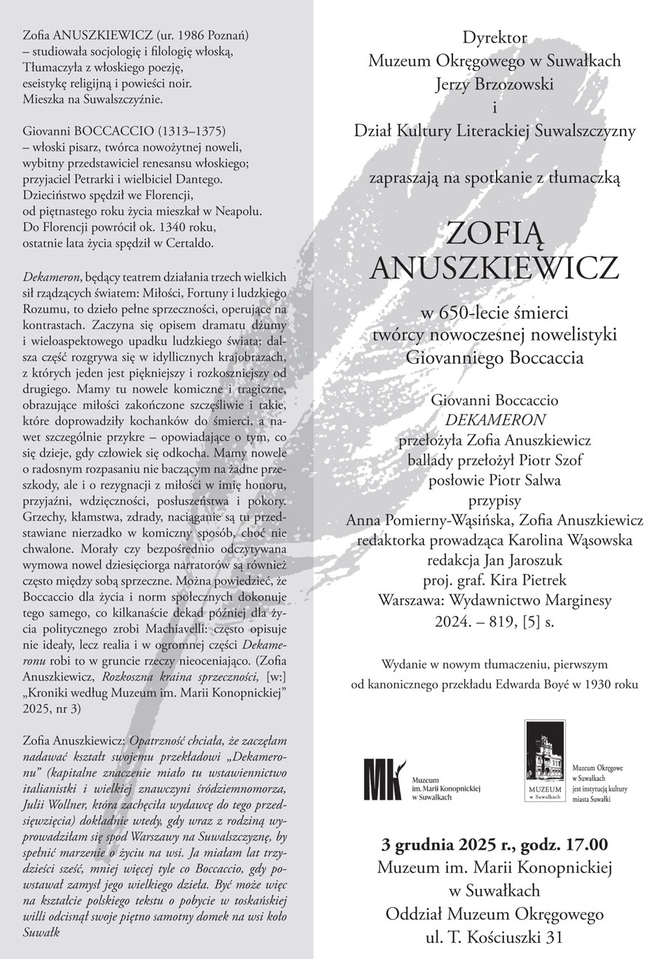 Dyrektor Muzeum Okręgowego w Suwałkach Jerzy Brzozowski i Dział Kultury Literackiej Suwalszczyzny zapraszają na spotkanie z tłumaczką Zofią Anuszkiewicz w 650-lecie śmierci twórcy nowoczesnej nowelistyki Giovanniego Boccaccia.