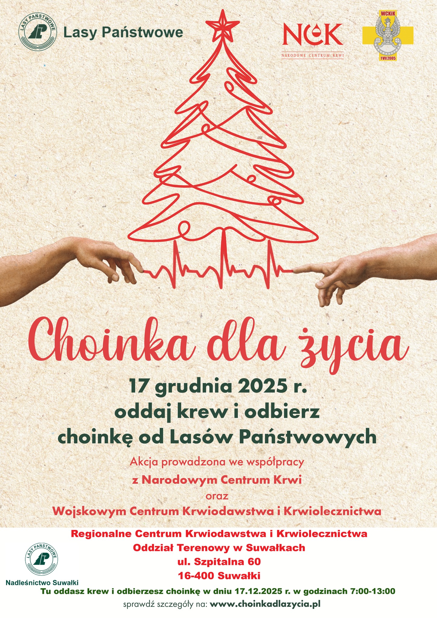 Nadleśnictwo Suwałki po raz kolejny włączyło się w ogólnopolską akcję "Choinka dla życia". Osoby, które w środę 17. grudnia oddadzą krew w Centrum Krwiodawstwa w Suwałkach, otrzymają na miejscu choinkę.