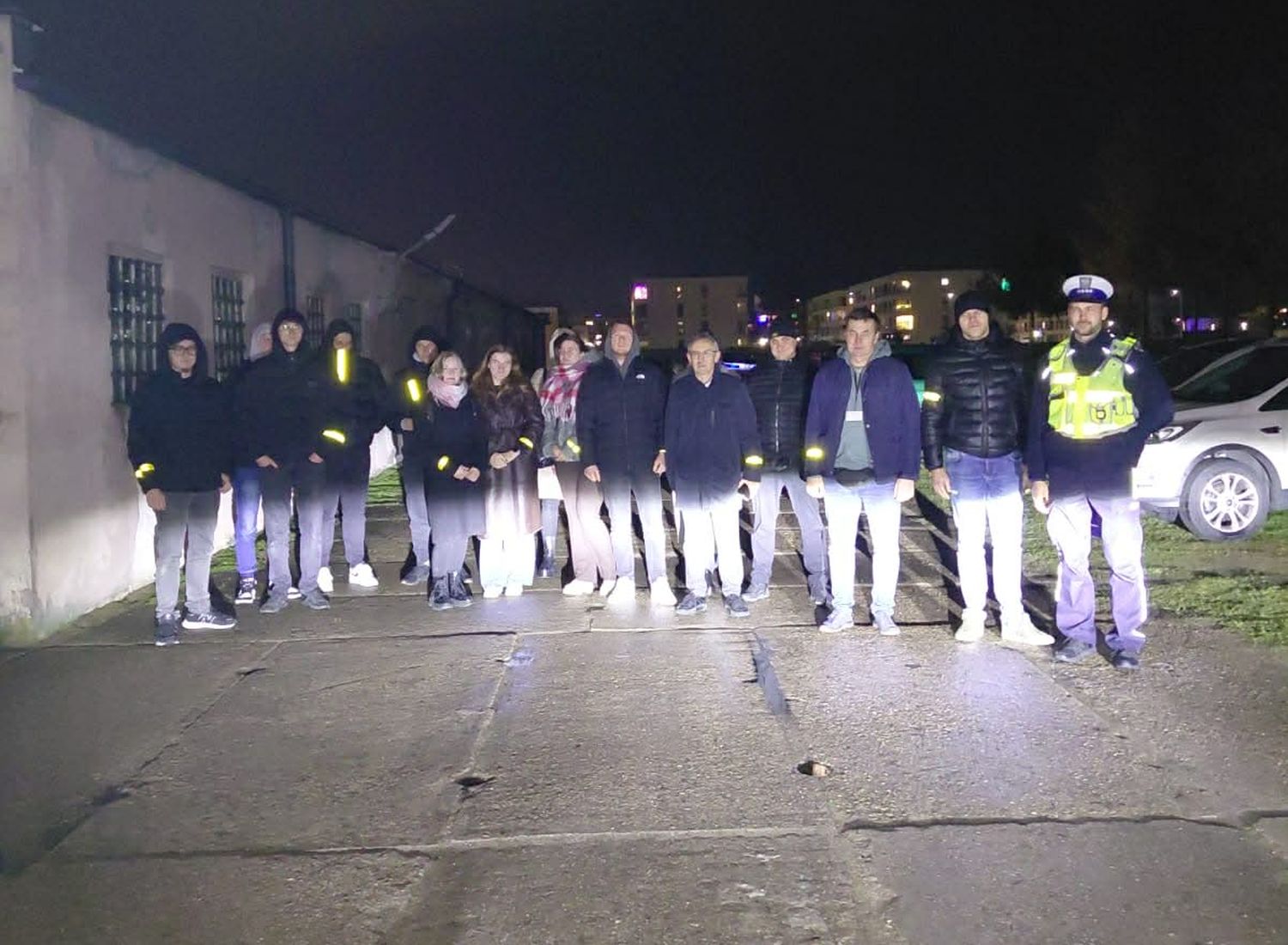 W słabo oświetlonym miejscu uczestnicy spotkania przystąpili do eksperymentu. Kilka metrów przed włączonymi latarkami ustawiono młodzież bez elementów odblaskowych, a następnie wręczono im opaski i kamizelki odblaskowe, które umieszczone zostały w widocznym miejscu. Dzięki temu wszyscy obserwujący mogli się przekonać, że znacznie lepiej widoczni są koledzy z odblaskami, niż Ci bez nich.