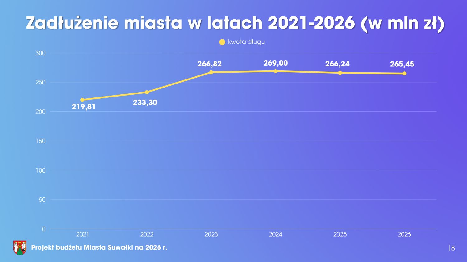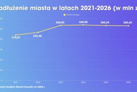 Zgodnie z prognozami, zadłużenie Miasta na koniec 2026 roku wyniesie 266,24 mln zł, co oznacza spadek w stosunku do roku 2025.