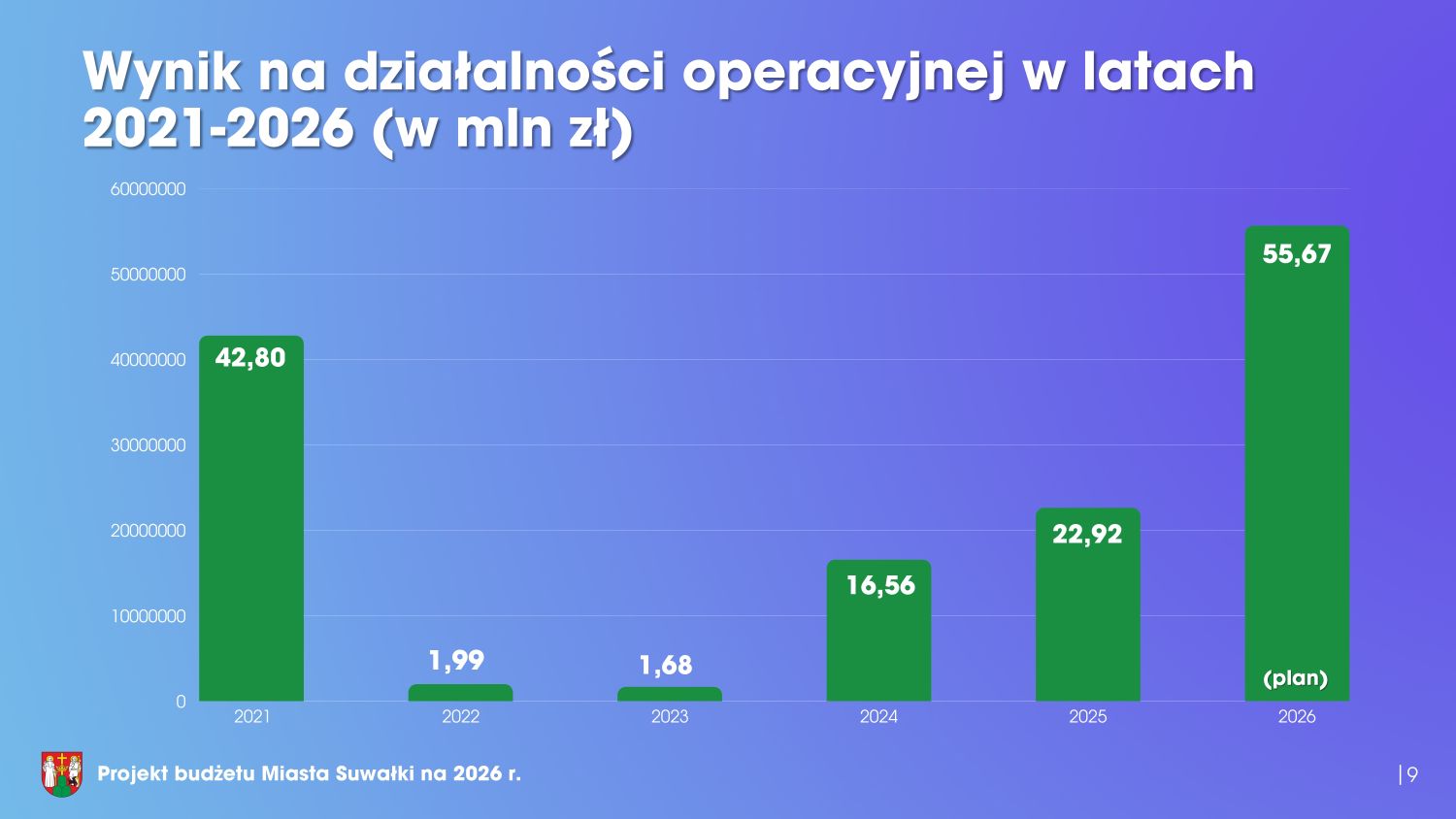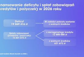 Plan na 2026 rok zakłada deficyt w wysokości 19 869 416 zł, który w całości ma zostać pokryty z wolnych środków. Jednocześnie miasto prognozuje nadwyżkę operacyjną na poziomie 55,67 mln zł, co świadczy o stabilnej kondycji budżetu w zakresie bieżących dochodów i wydatków.