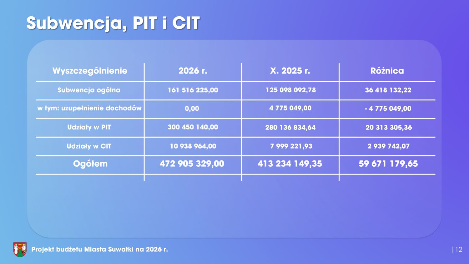 Miasto Suwałki zaprezentowało projekt budżetu na 2026 rok, który wyznacza kierunki finansowe i inwestycyjne na najbliższe 12 miesięcy. Zgodnie z założeniami, dochody wyniosą 830 457 991 zł, natomiast wydatki osiągną poziom 850 327 407 zł. Na realizację inwestycji przewidziano 169 775 482 zł, co potwierdza utrzymanie proinwestycyjnego charakteru miejskich finansów.