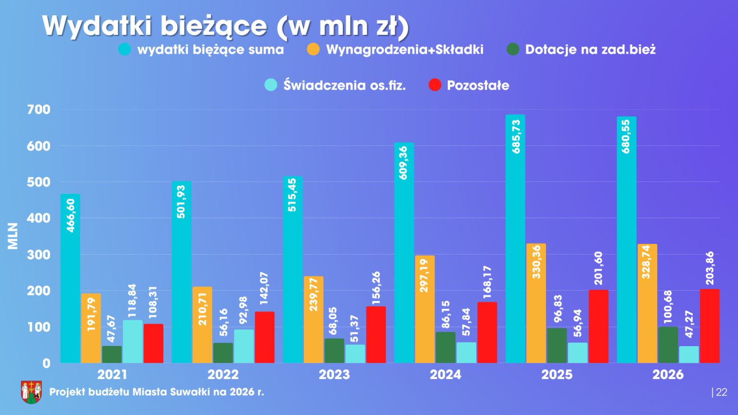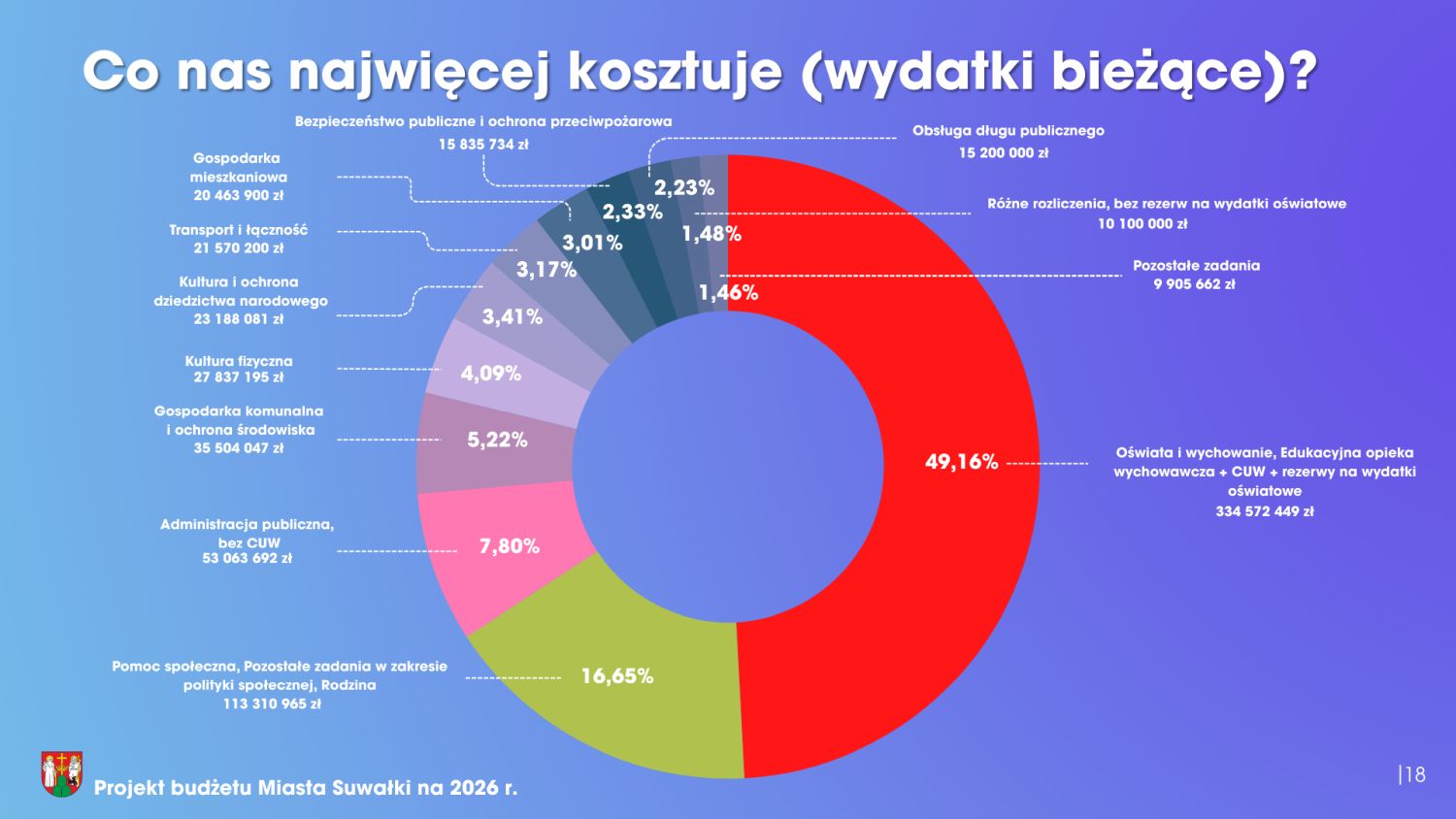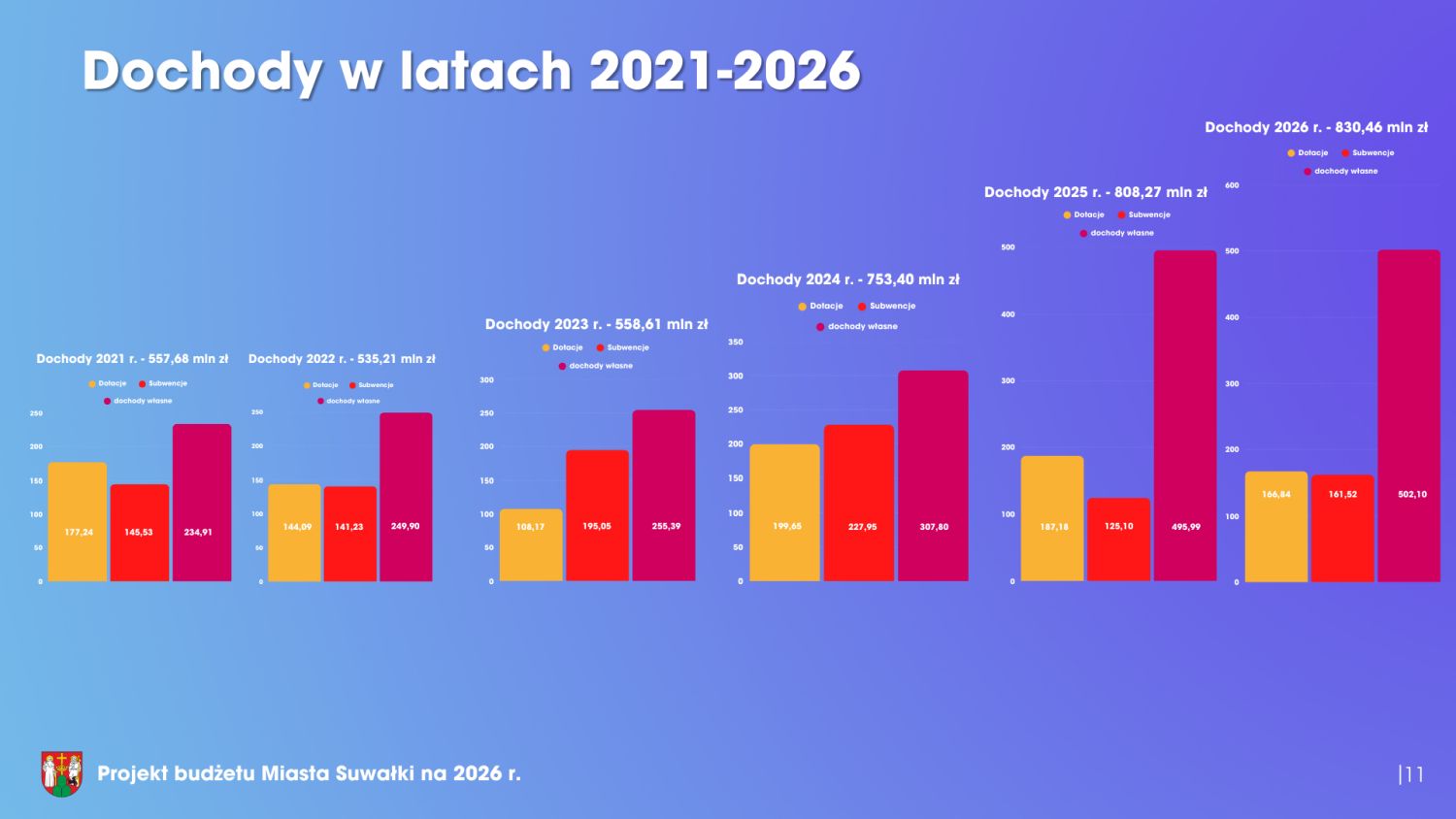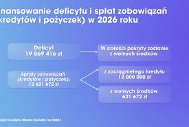 - Budżet miasta na 2026 rok jest budżetem rekordowym. Podkreślmy to wyraźnie – rekordowym. Dochody miasta przekraczają 830 milionów złotych. To są fakty. Wydatki natomiast wyniosą 850 milionów złotych. Co szczególnie istotne, dochody bieżące są wyższe od wydatków bieżących o ponad 55,5 miliona złotych, co stanowi solidny fundament stabilności finansowej miasta. Należy również podkreślić, że planowany deficyt zostanie w całości pokryty wypracowanymi wolnymi środkami, bez konieczności zaciągania kredytów, co potwierdza odpowiedzialne i długofalowe zarządzanie finansami miasta Suwałki.