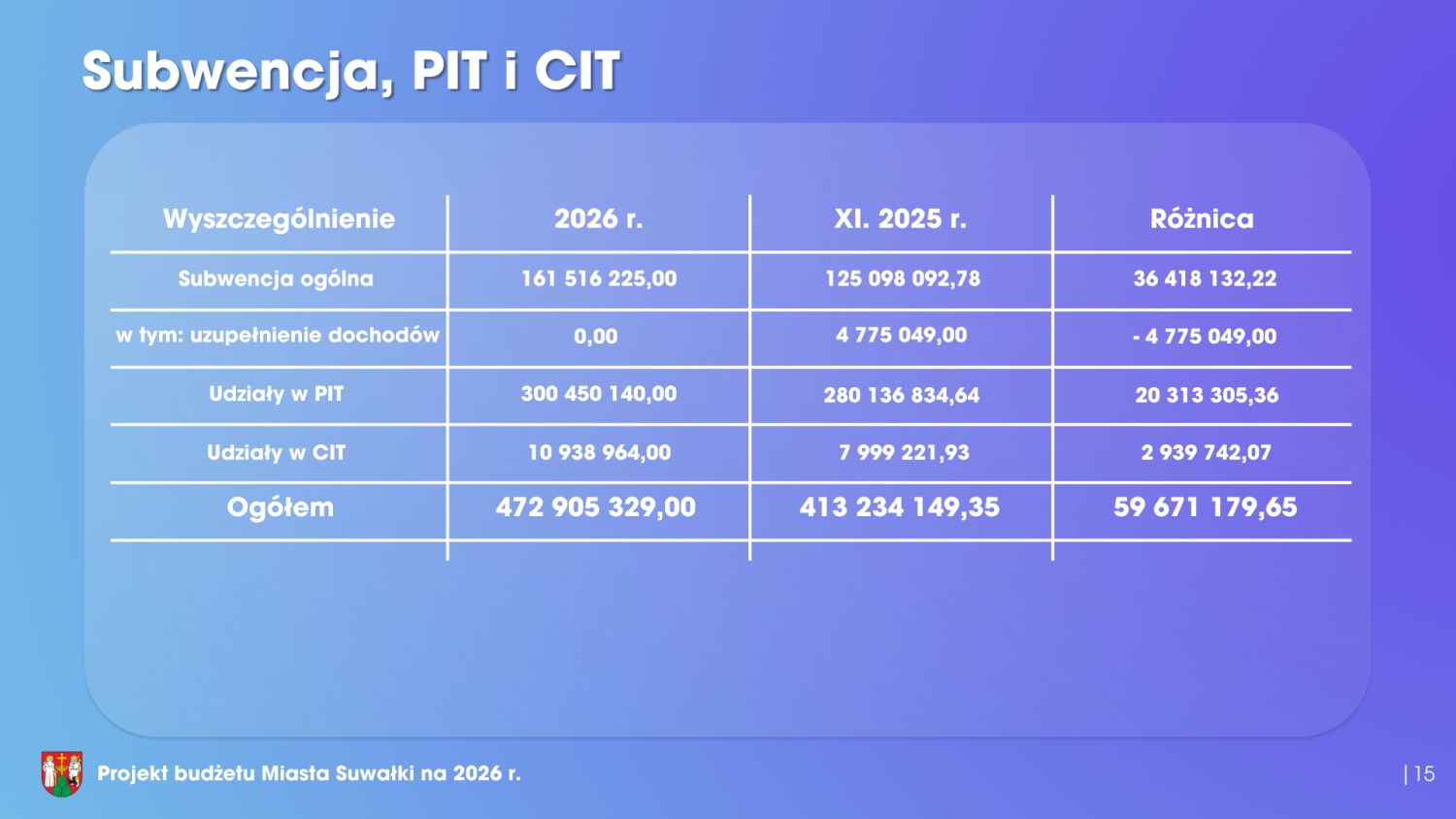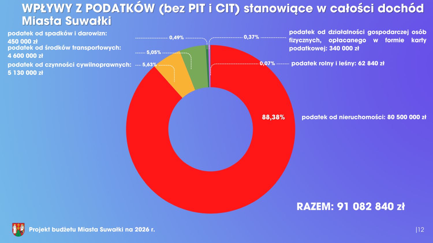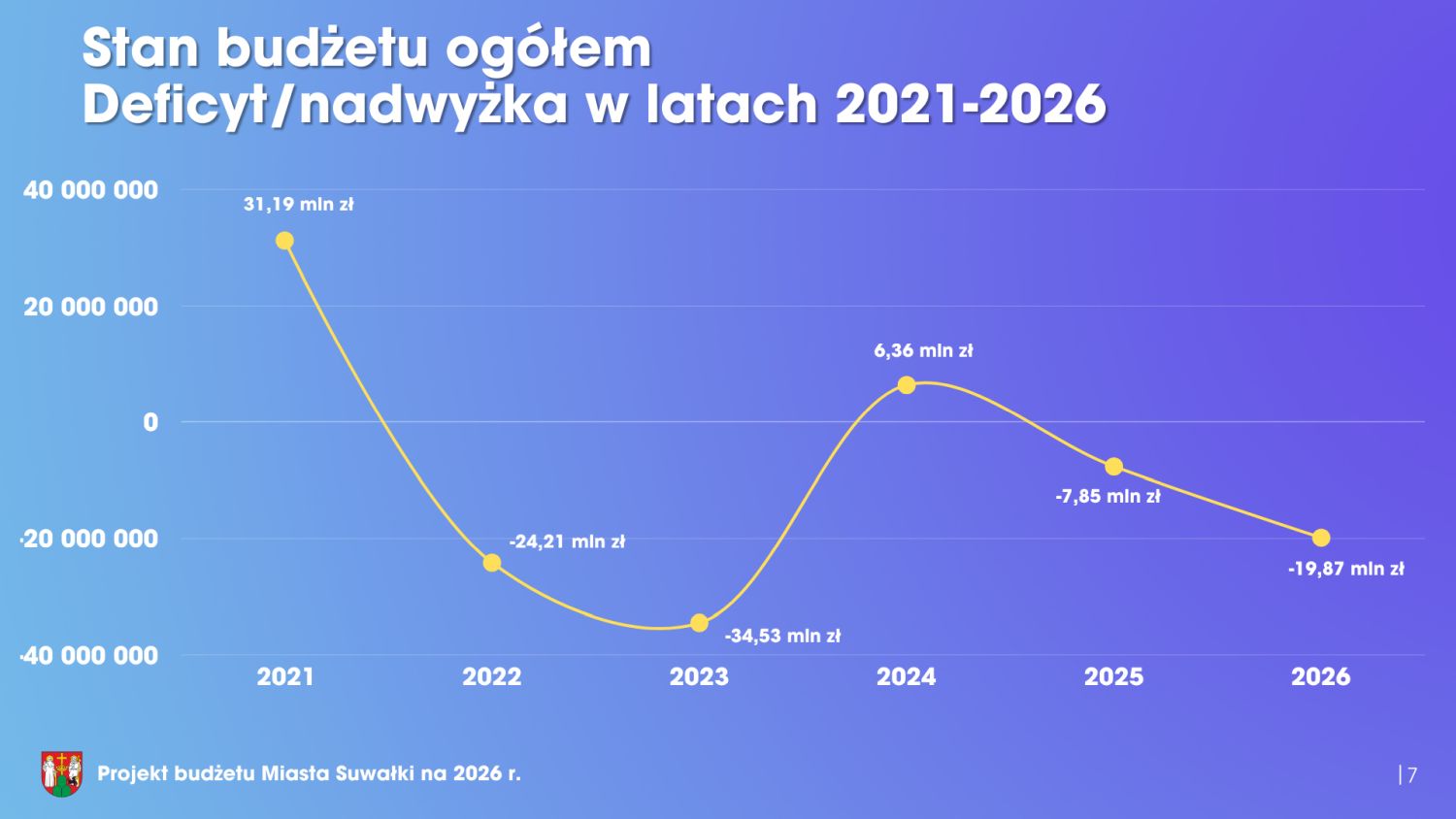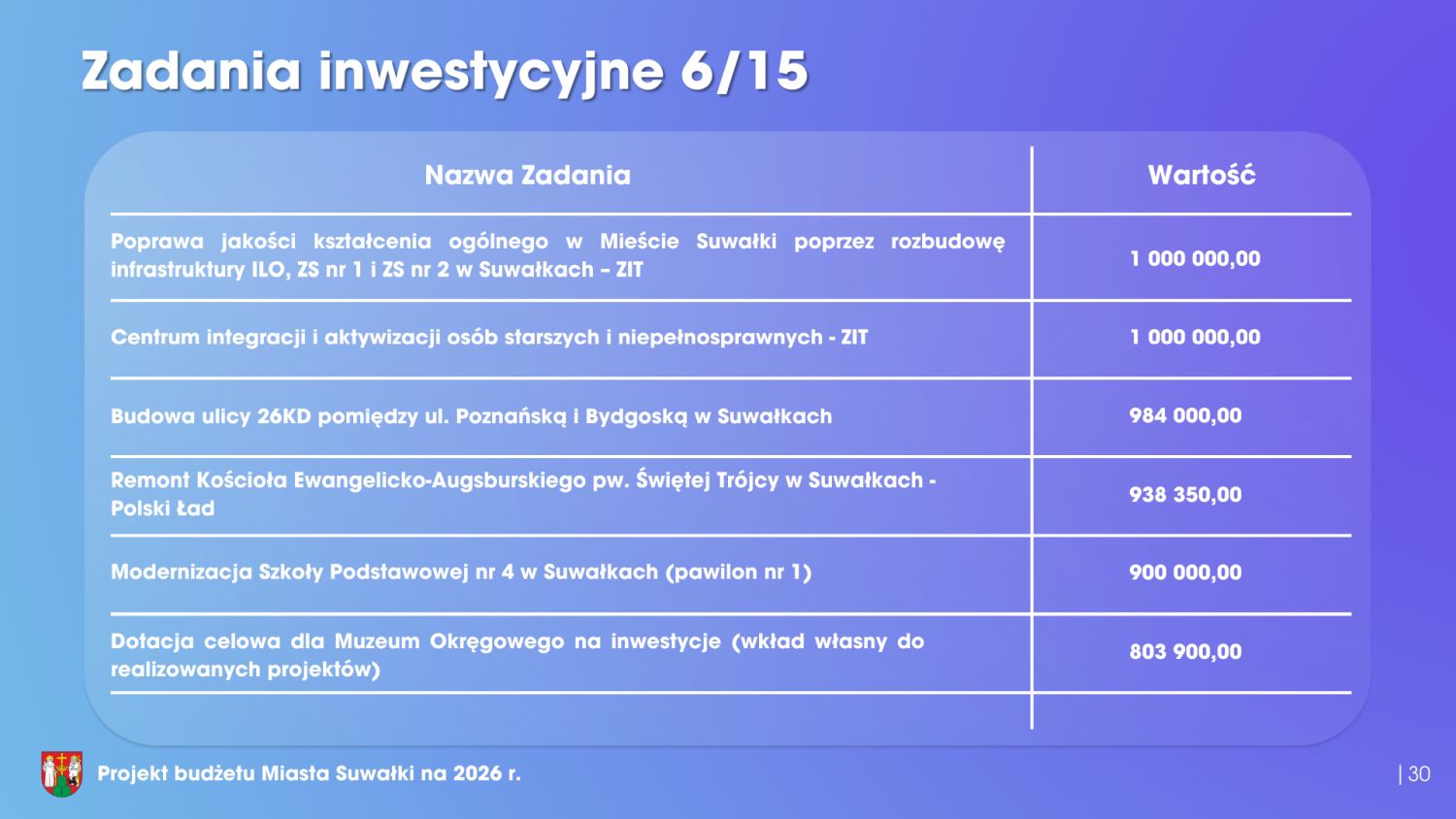 Rozpatrzenie projektu uchwały w sprawie budżetu miasta na 2026 rok to główny punkt sesji Rady Miasta w Suwałkach, która miała miejsce w poniedziałek w miejskim Ratuszu. Budżet Suwałk na 2026 rok wynosi 830 milionów złotych po stronie dochodów oraz 850 milionów złotych po stronie wydatków. Blisko 170 mln zł przeznaczonych zostanie na inwestycje, a ponad 18 mln zł na podwyżki dla pracowników miejskich i nauczycieli. Ponad 19 mln zł wyniesie deficyt, jednak prognozowana jest też nadwyżka ponad 55 mln zł na działalności bieżącej miasta. Zadłużenie miasta to kwota ponad 265 mln zł. Szczegółowe informacje dostępne są na poniższej prezentacji.