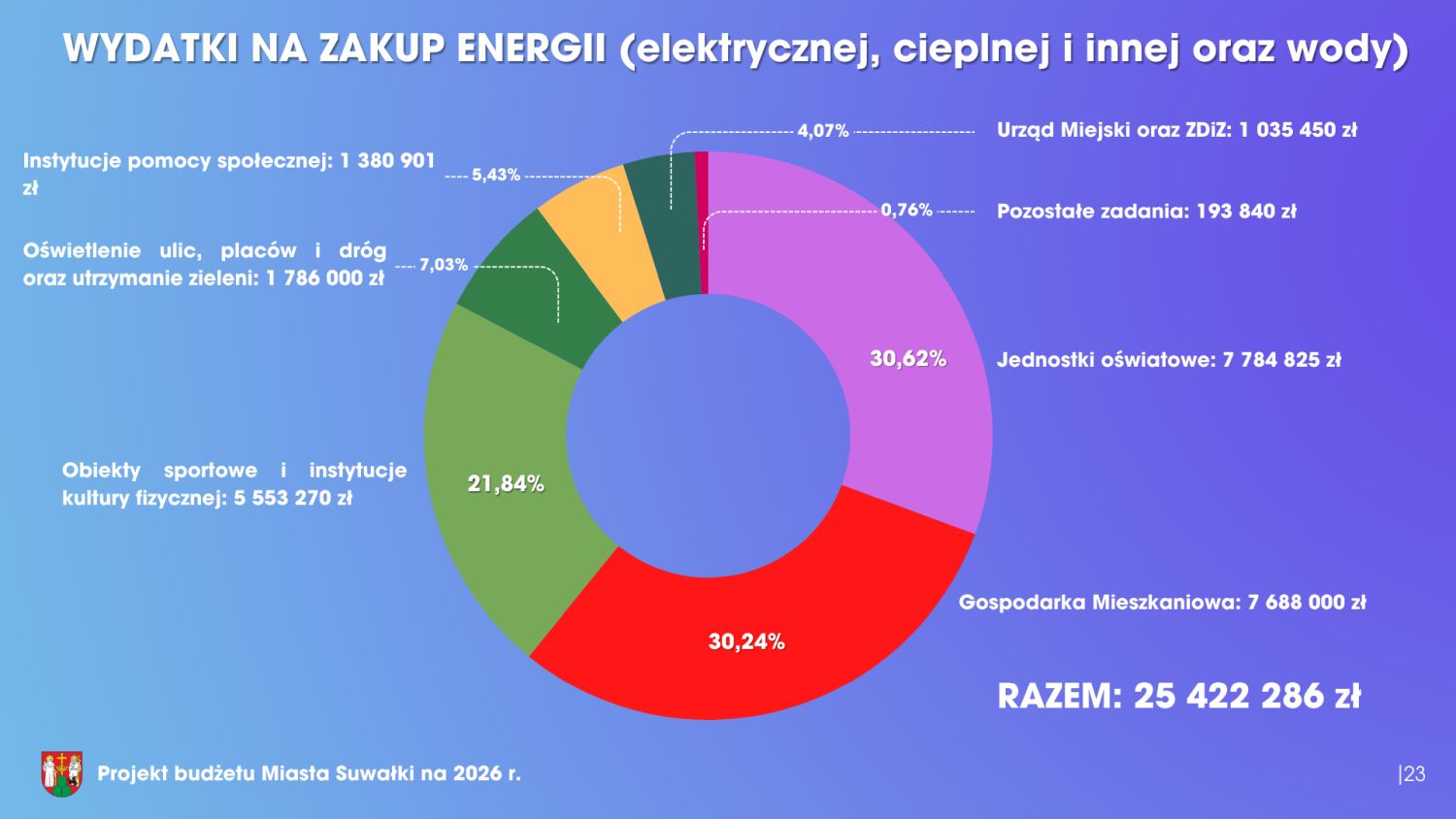 Jakie założenia zostały przyjęte? Między innymi założyliśmy, że ceny energii, w tym energii elektrycznej, pozostaną na poziomie roku 2025. Czy to się sprawdzi, pokaże czas. Wiemy, że nasze przedsiębiorstwo energetyki cieplnej wygrało przetarg na dostawę i sprzedaż energii elektrycznej dla naszego miasta oraz całej grupy zakupowej. Nadal jednak istnieją koszty przesyłu i dystrybucji, ponieważ na całkowitą cenę energii składa się nie tylko sama energia, ale również opłaty dodatkowe. Cenę energii cieplnej przyjęliśmy z uwzględnieniem 5-procentowej obniżki w stosunku do cen obowiązujących w bieżącym roku. Nie mamy jednak pewności, czy to założenie w pełni się zrealizuje. Zużycie ciepła w dużej mierze zależy od warunków pogodowych, a te z roku na rok są coraz łagodniejsze – mamy coraz mniej dni z ujemnymi temperaturami, co świadczy o ocieplaniu się klimatu. Ceny opłat za wodę i kanalizację również pozostają na poziomie roku 2025. Obowiązuje zatwierdzona taryfa, która będzie miała zastosowanie w przyszłym roku. Przyjęliśmy także podwyżki dla naszych pracowników – obowiązujące od 1 stycznia. Część tych podwyżek została ujęta bezpośrednio w budżetach jednostek organizacyjnych, natomiast środki na podwyżki planowane w drugim półroczu zostały zabezpieczone w rezerwie  - mówił podczas prezentacji Czesław Renkiewicz, prezydent Suwałk.
