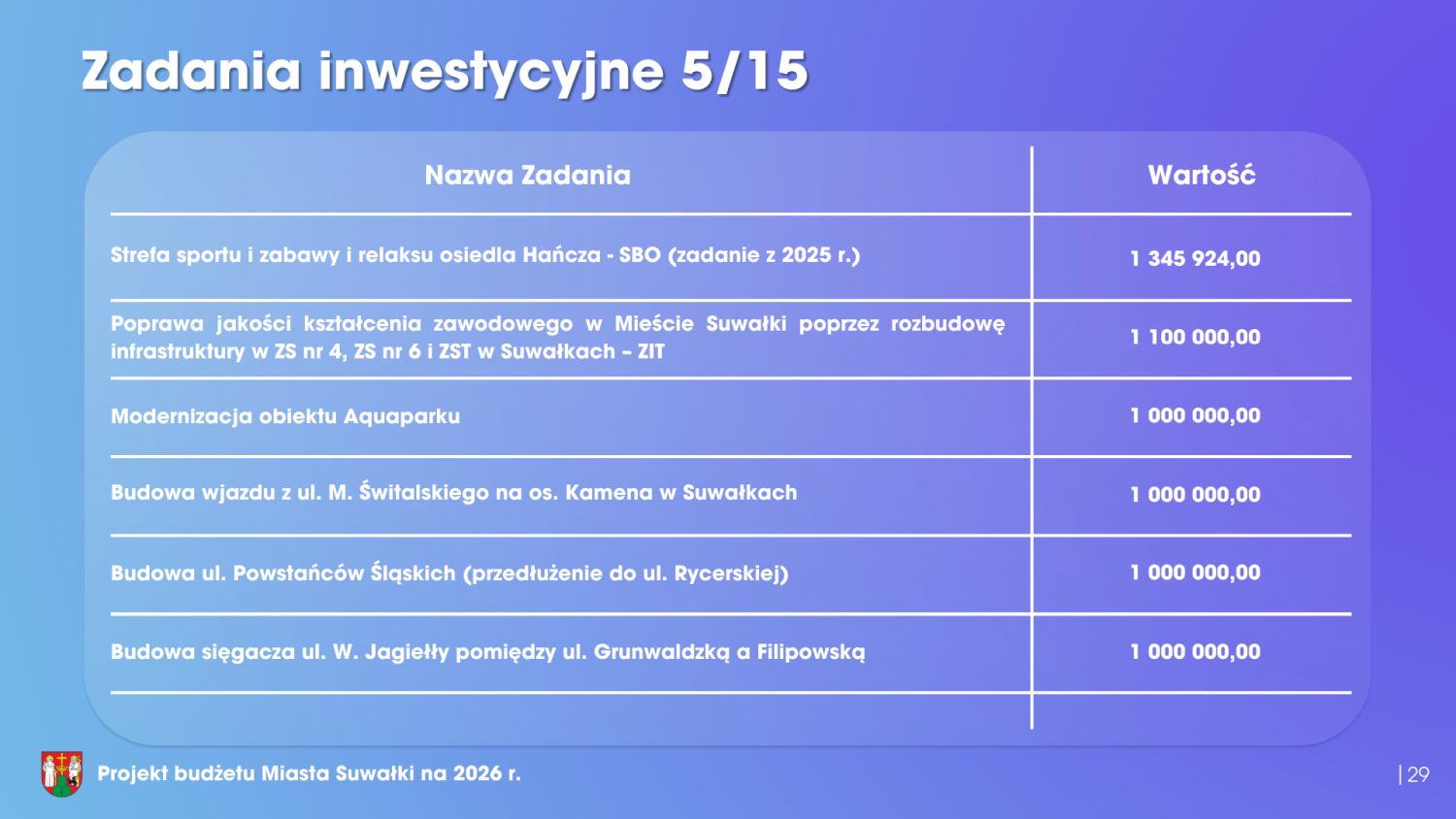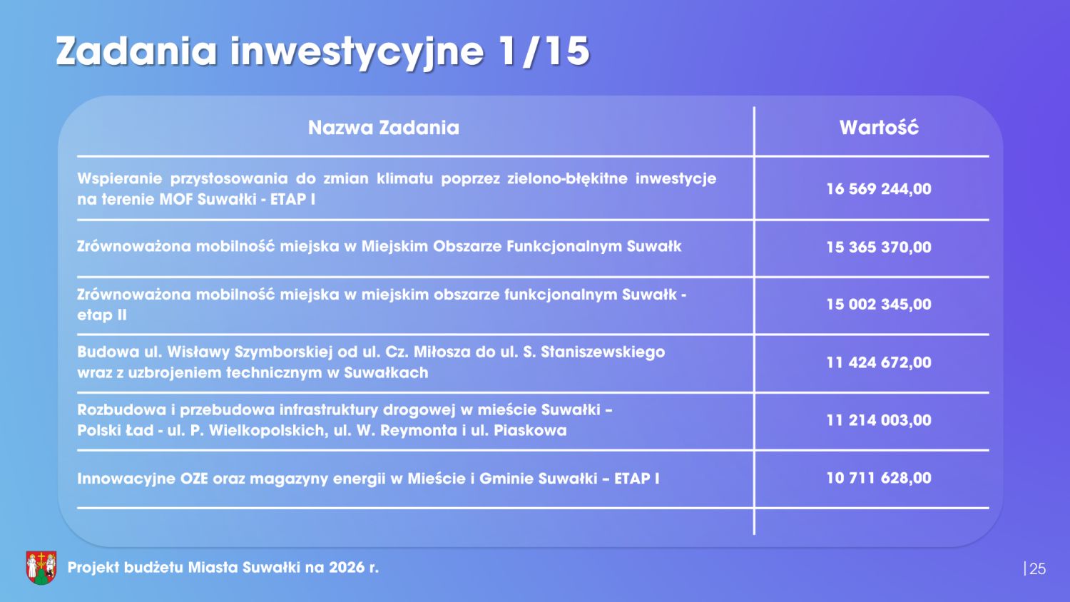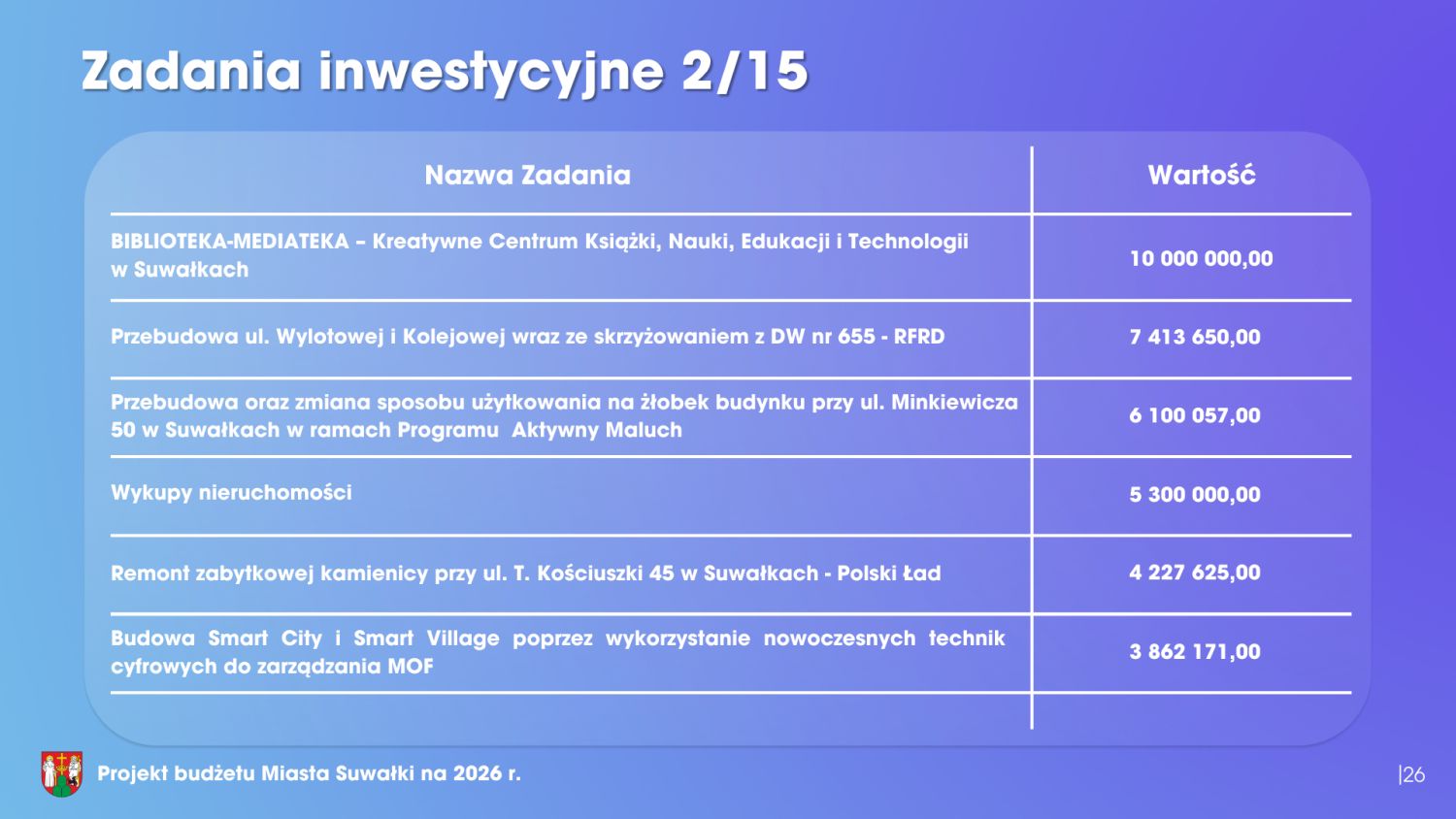 Istotnym elementem budżetu jest również program inwestycyjny. W 2026 roku nakłady inwestycyjne wyniosą blisko 170 milionów złotych. Warto jednak zaznaczyć, że ponad połowa tej kwoty pochodzi z dofinansowań zewnętrznych – jest to 85,3 miliona złotych. Podsumowując, przedłożony projekt budżetu miasta Suwałki na 2026 rok w sposób kompleksowy odpowiada na bieżące potrzeby mieszkańców, realizuje cele rozwojowe oraz gwarantuje stabilność finansową samorządu. Ten budżet wyznacza bardzo dobre kierunki rozwoju. Dlatego Klub Radnych „Razem dla Suwałk” z pełnym przekonaniem popiera projekt budżetu i będzie głosował za jego przyjęciem.