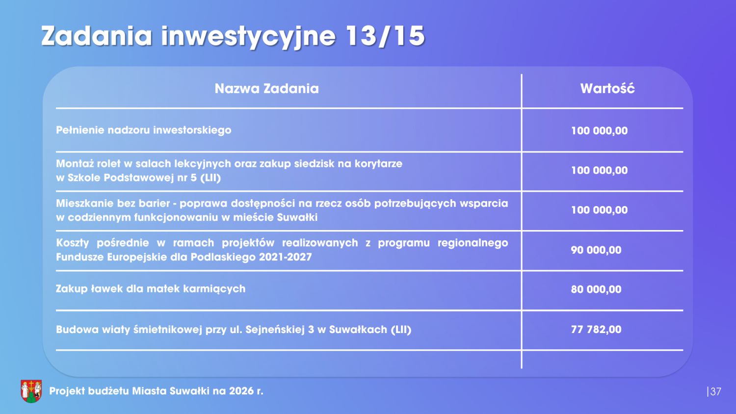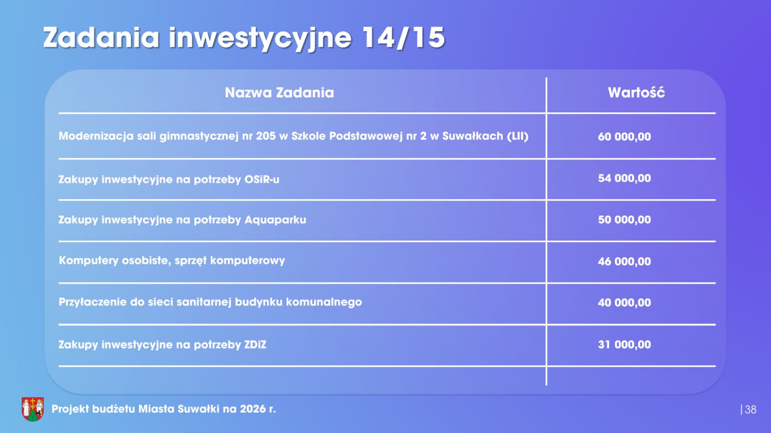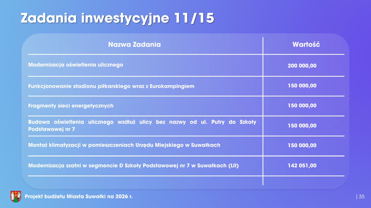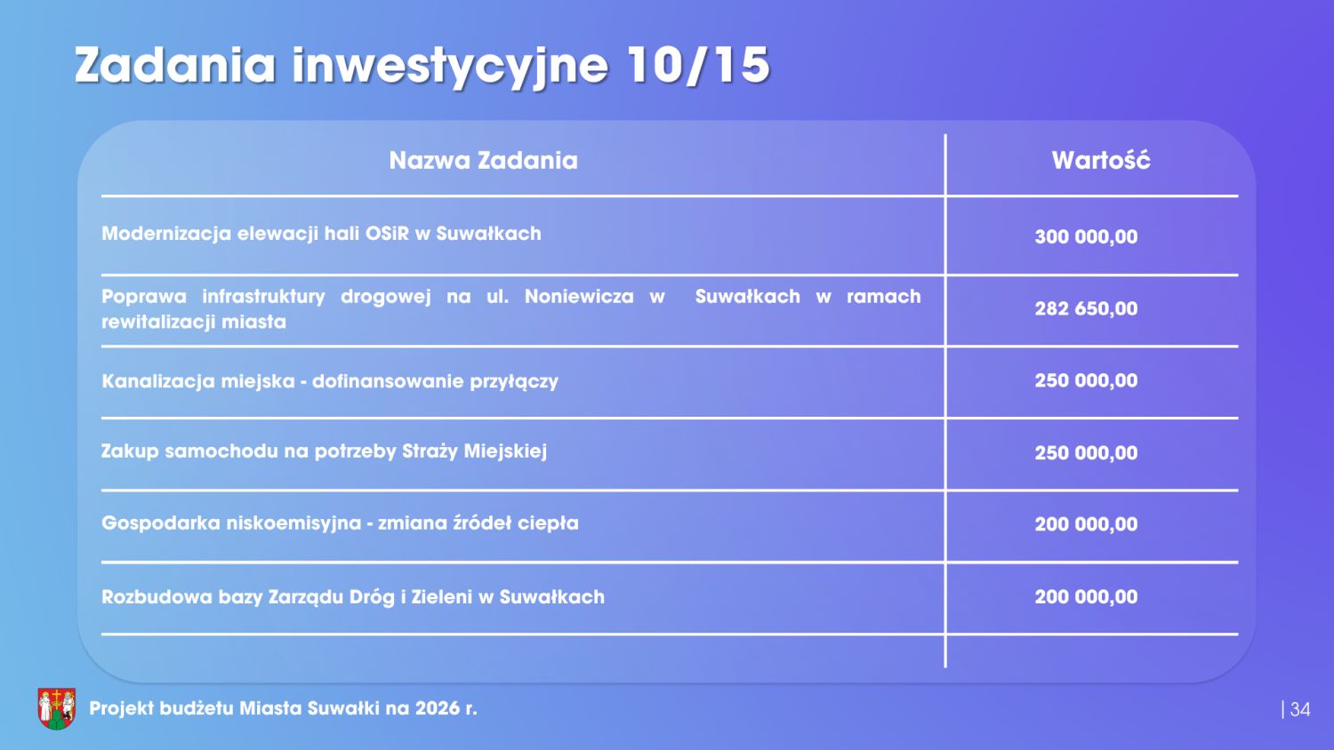 Istotnym elementem budżetu jest również program inwestycyjny. W 2026 roku nakłady inwestycyjne wyniosą blisko 170 milionów złotych. Warto jednak zaznaczyć, że ponad połowa tej kwoty pochodzi z dofinansowań zewnętrznych – jest to 85,3 miliona złotych. Podsumowując, przedłożony projekt budżetu miasta Suwałki na 2026 rok w sposób kompleksowy odpowiada na bieżące potrzeby mieszkańców, realizuje cele rozwojowe oraz gwarantuje stabilność finansową samorządu. Ten budżet wyznacza bardzo dobre kierunki rozwoju. Dlatego Klub Radnych „Razem dla Suwałk” z pełnym przekonaniem popiera projekt budżetu i będzie głosował za jego przyjęciem.