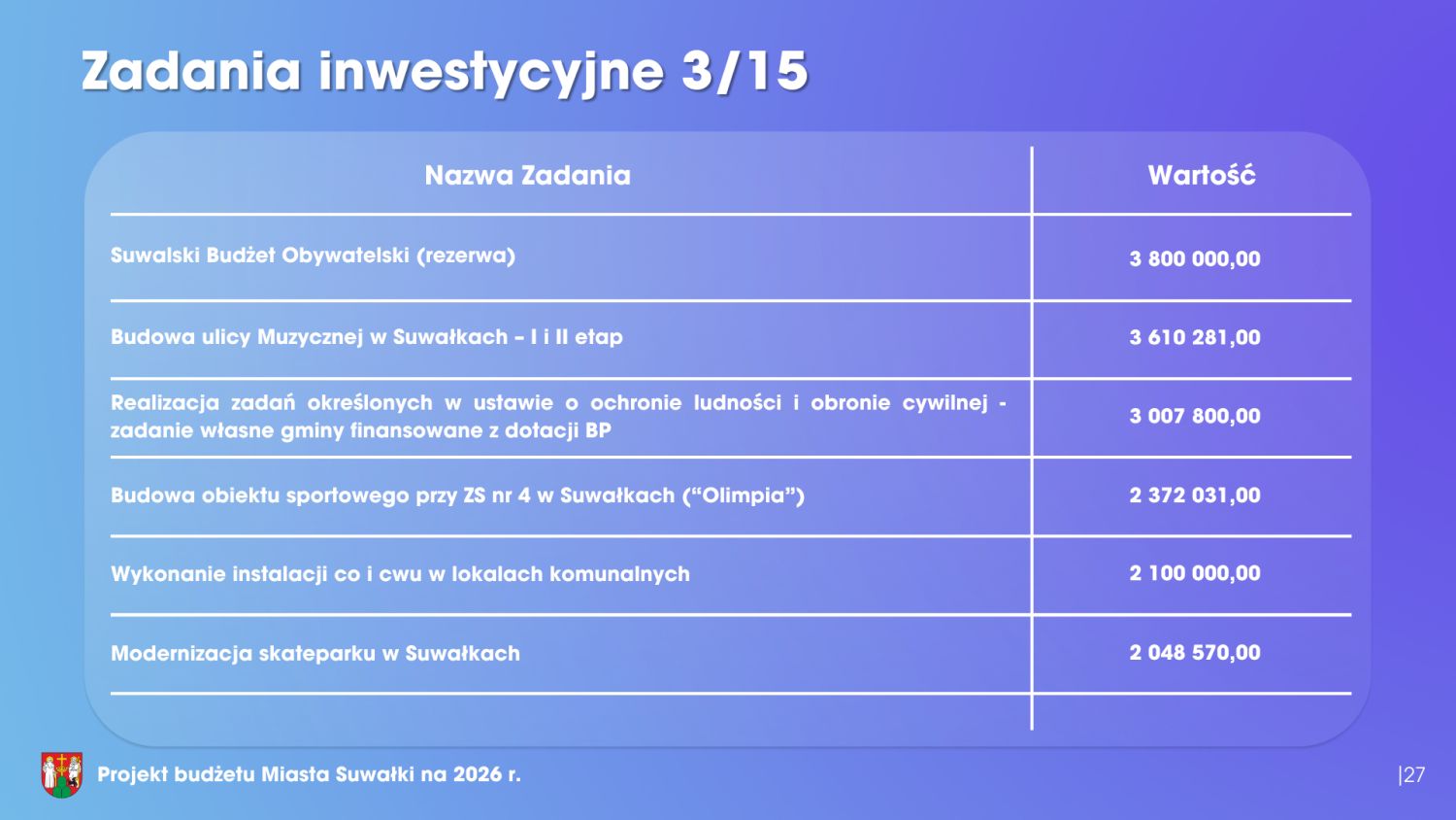 W kolejnym roku Suwałki mogą liczyć na dodatkowe środki w wysokości ponad 4,5 miliona złotych. Przypomnę również, że w skali kraju rząd zabezpieczył ponad 34 miliardy złotych na realizację programu ochrony ludności i obrony cywilnej w 2027 roku, a zapowiadana jest jego dalsza kontynuacja. Podsumowując, również w sposób refleksyjny: czy ten projekt budżetu jest idealny? Z pewnością nie. Zawsze chcielibyśmy, aby środków było więcej, a deficyt – mniejszy. Pozwolę sobie jednak stwierdzić, że ten budżet odpowiada na najważniejsze potrzeby mieszkańców. Jesteśmy miastem średniej wielkości, byłym miastem wojewódzkim, funkcjonującym w określonym położeniu geograficznym, a także w konkretnej sytuacji geopolitycznej i ekonomicznej. Koalicja Obywatelska również poprze projekt tego budżetu i będzie głosowała za jego przyjęciem.