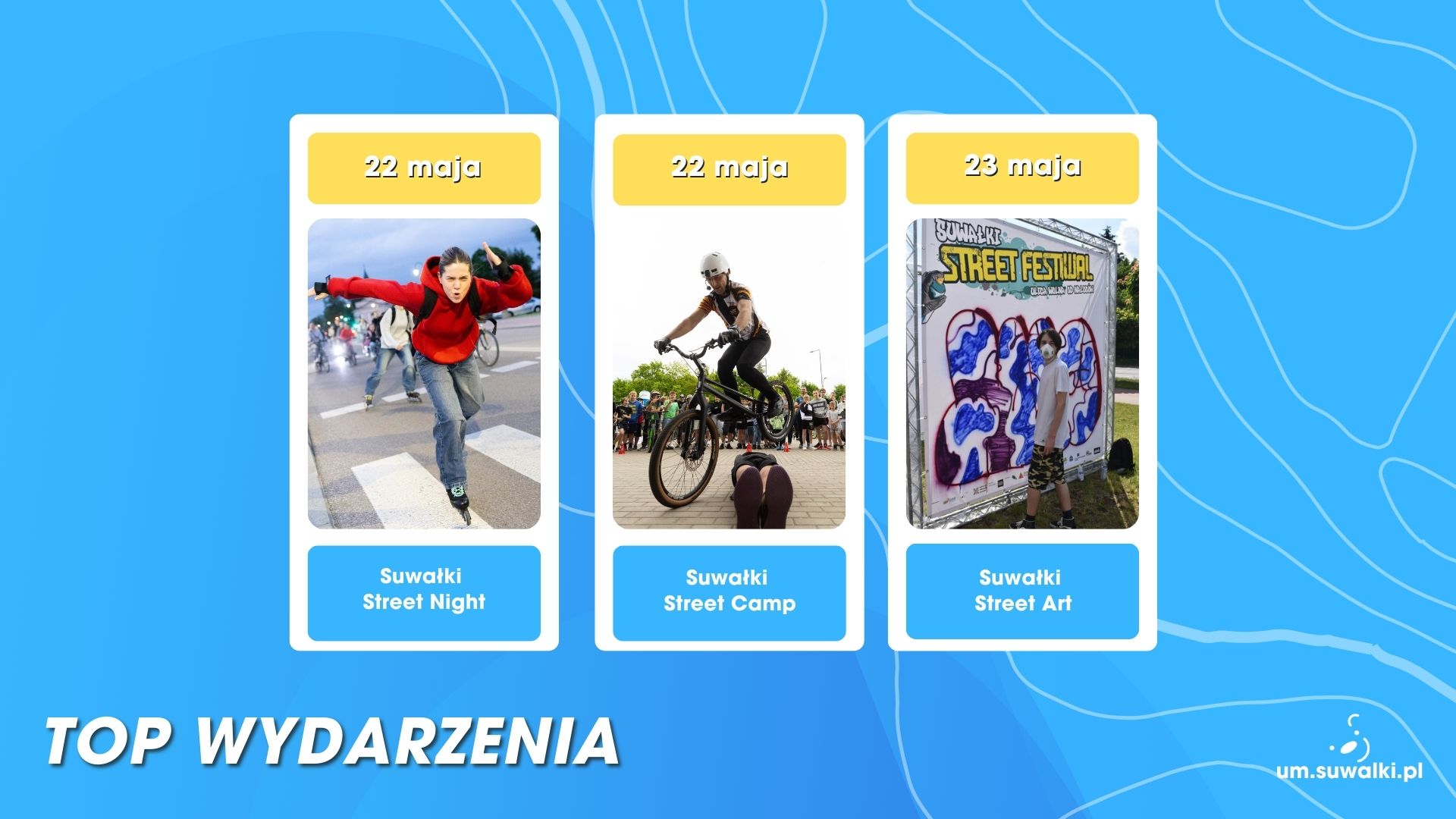 - Suwałki Street Festiwal – wydarzenie dedykowane młodzieży, wypełnione kulturą miejską, sportami ekstremalnymi i nowoczesną energią.