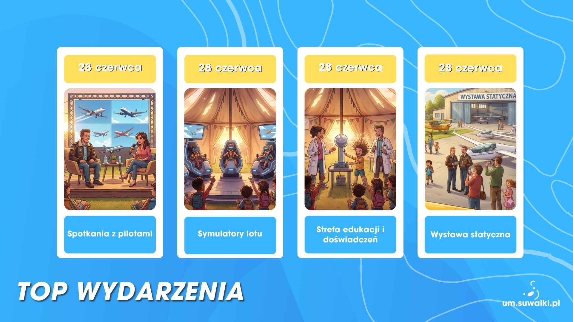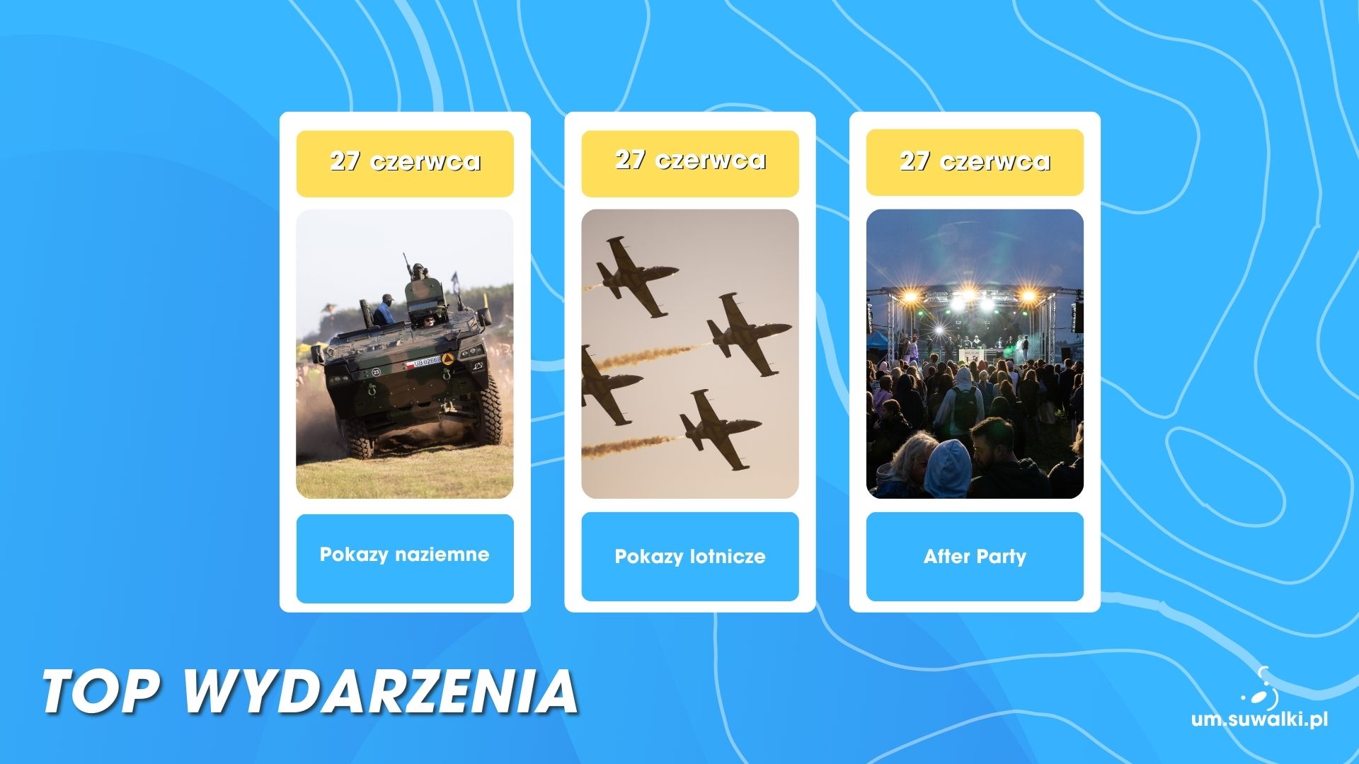 - Odlotowe Suwałki AIR SHOW – spektakularne widowisko lotnicze, które co roku przyciąga całe rodziny spragnione emocji na najwyższym poziomie, w tym roku w formie dwudniowego wydarzenia.