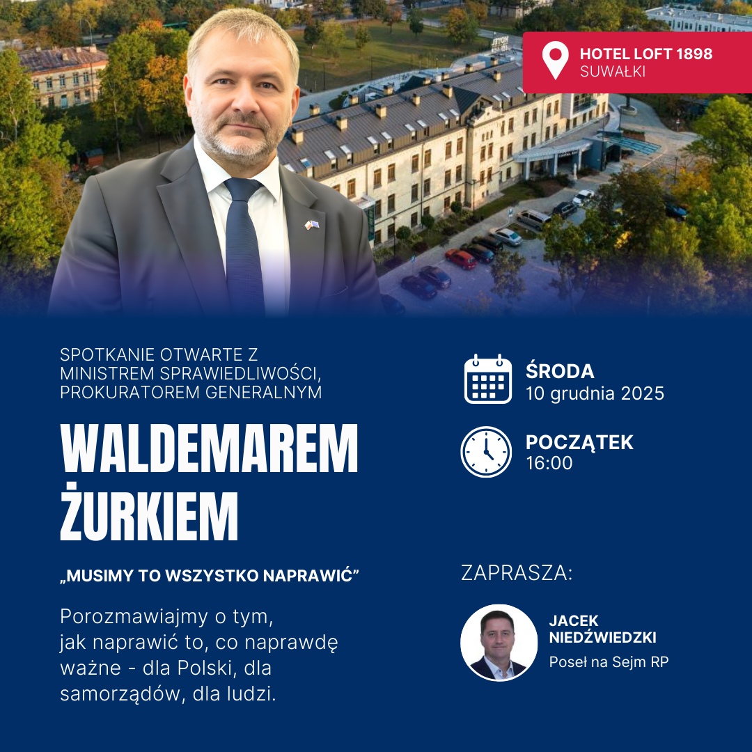 Jacek Niedźwiedzki, poseł Koalicji Obywatelskiej zaprasza wszystkich chętnych do udziału w spotkaniu z Waldemarem Żurkiem, Ministrem Sprawiedliwości, pod hasłem "Musimy to wszystko naprawić". Spotkanie rozpocznie się w środę 10. grudnia o godzinie 16.00 w hotelu Loft w Suwałkach.