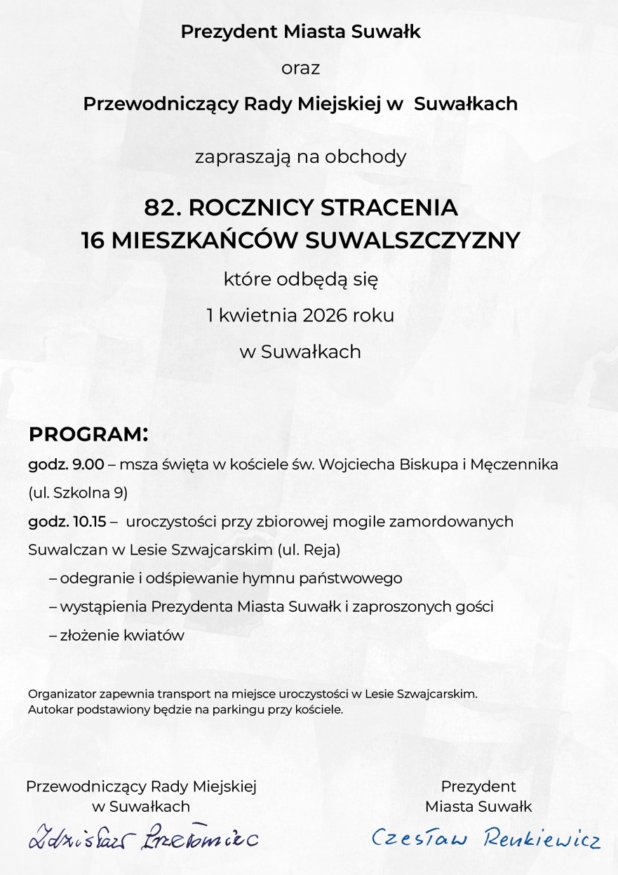 Z życia miasta 30/03/2026 / 0 Komentarzy Upamiętnią rocznicę stracenia 16. mieszkańców Suwalszczyzny Prezydent Suwałk Czesław Renkiewicz oraz Przewodniczący Rady Miejskiej Zdzisław Przełomiec zapraszają mieszkańców do udziału w obchodach 82. rocznicy stracenia 16 mieszkańców Suwalszczyzny. Dodaj komentarz Nazwisko lub pseudonim Temat Komentarz O formatach tekstu Zobacz także Zamknięte przejście nad Zalewem Z życia miasta 28/03/2026 Suwalczanie na Miejskiej Drodze Krzyżowej Z życia miasta 27/03/2026 Weź udział w Grze Miejskiej "Kamienie na Szaniec" Z życia miasta 27/03/2026 Nowe wymogi żywieniowe w szkołach. Warsztaty branży gastronomicznej w Suwałkach Z życia miasta 26/03/2026 Powstanie parking przy Przedszkolu nr 10 Z życia miasta 26/03/2026 Hałasy z PEC niepokoją mieszkańców Z życia miasta 26/03/2026