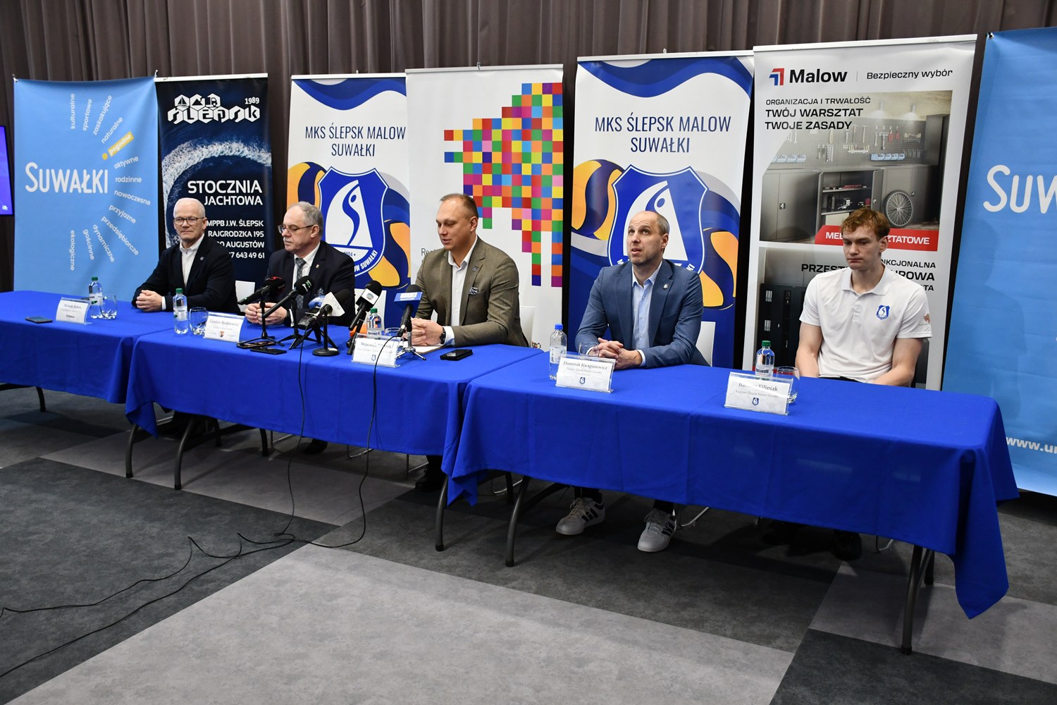 Konferencja prasowa dotycząca strategicznych decyzji Klubu Ślepsk Malow Suwałki na kolejny sezon PlusLigi odbyła się w czwartek (19.02) w siedzibie Klubu w hali Suwałki Arena. Z mediami spotkali się prezes Ślepska Wojciech Winnik, trener Dominik Kwapisiewicz, kapitan drużyny Bartosz Filipiak oraz Czesław Renkiewicz, prezydent Suwałk i Roman Kaleta, prezes zarządu firmy Malow.