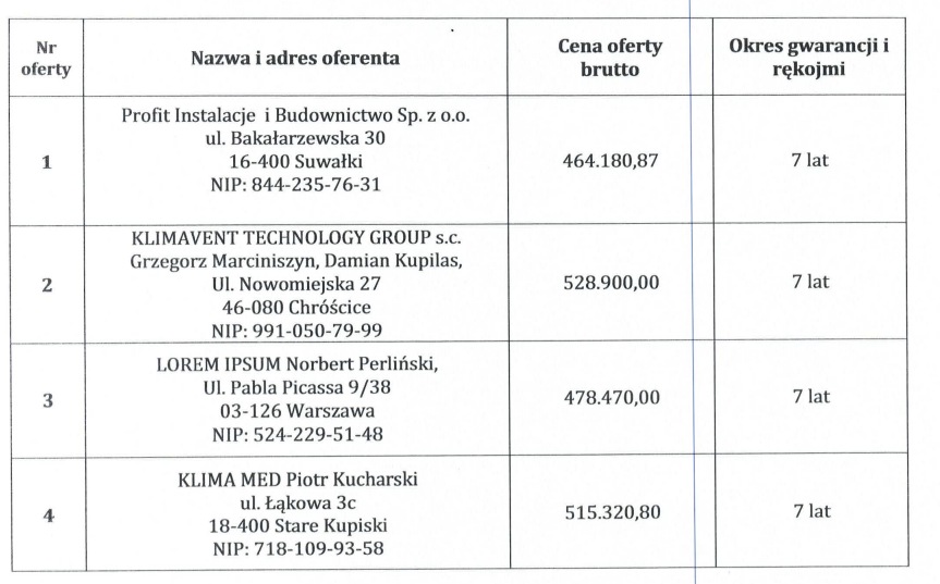 Kwota, jaką Miasto zamierza przeznaczyć na sfinansowanie zamówienia wynosi 535 tysięcy złotych brutto. Do przetargu w wyznaczonym terminie wpłynęły cztery oferty i wszystkie są niższe od zakładanego w budżecie wydatku. Najkorzystniejszą cenowo ofertę złożyła firma z Suwałk Profit Instalacje i Budownictwo Sp. z o.o. na kwotę 464 tysięcy złotych. Teraz władze miasta muszą zdecydować o wyborze którejś z ofert.