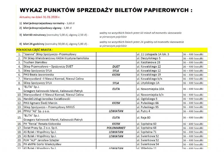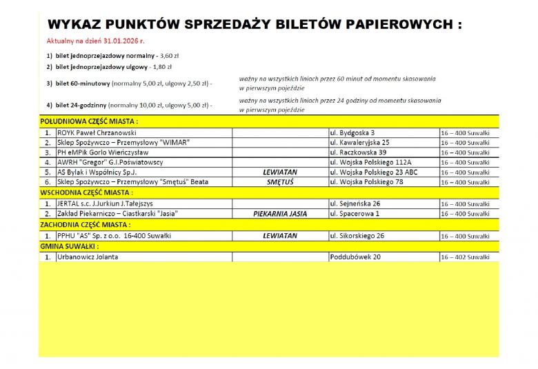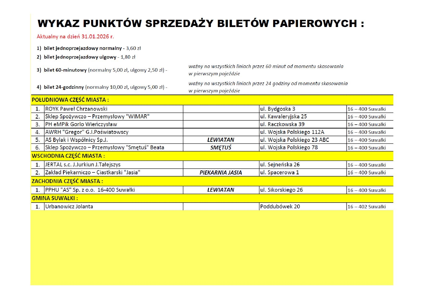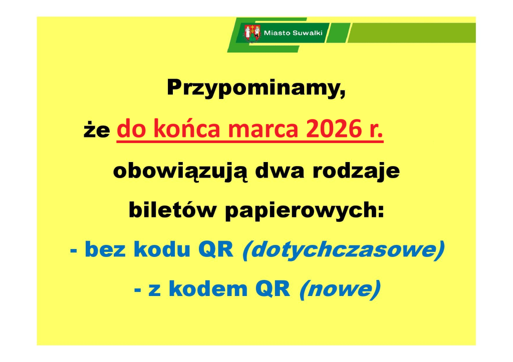 Przedsiębiorstwo Gospodarki Komunalnej w Suwałkach przekazało, że do końca marca przedłużono ważność dotychczasowych biletów papierowych bez kodu QR na komunikację miejską w Suwałkach.