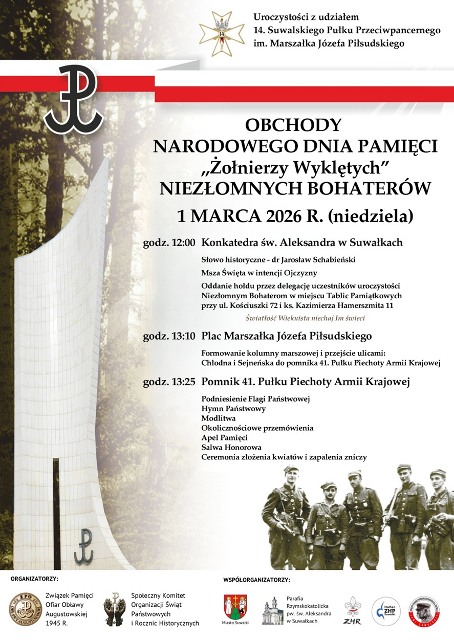 Związek Pamięci Ofiar Obławy Augustowskiej 1945 Roku oraz Społeczny Komitet Organizacji Świąt Państwowych i Rocznic Historycznych zapraszają mieszkańców Suwałk i regionu do udziału w uroczystych obchodach Narodowego Dnia Pamięci „Żołnierzy Wyklętych" - Niezłomnych Bohaterów, które odbędą się w niedzielę 1. marca w Suwałkach.