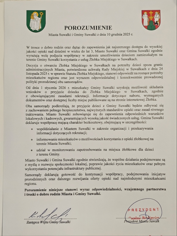 W środę (10.12) w suwalskim Ratuszu miała miejsce konferencja prasowa w sprawie osiągniętego porozumienia pomiędzy Miastem i Gminą Suwałki, dotyczącego opieki nad najmłodszymi mieszkańcami w Żłobku Miejskim. Na jej mocy dzieci z gminy Suwałki będą miały dostęp do żłobków miejskich prowadzonych przez Miasto Suwałki. Do tej pory dzieci z pobliskiej gminy mogły jedynie uczęszczać do przedszkoli prywatnych. Umowę podpisali Czesław Renkiewicz, prezydent Suwałk oraz Krzysztof Gwaj, zastępca Wójta Gminy Suwałki.