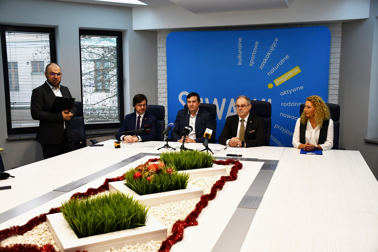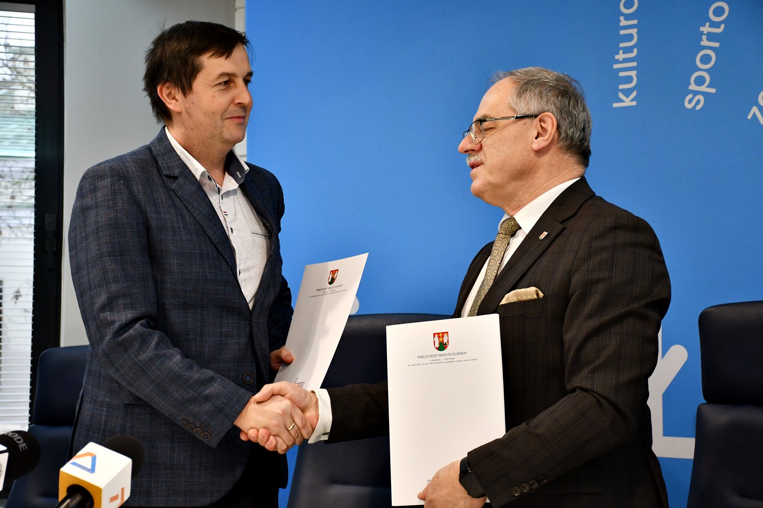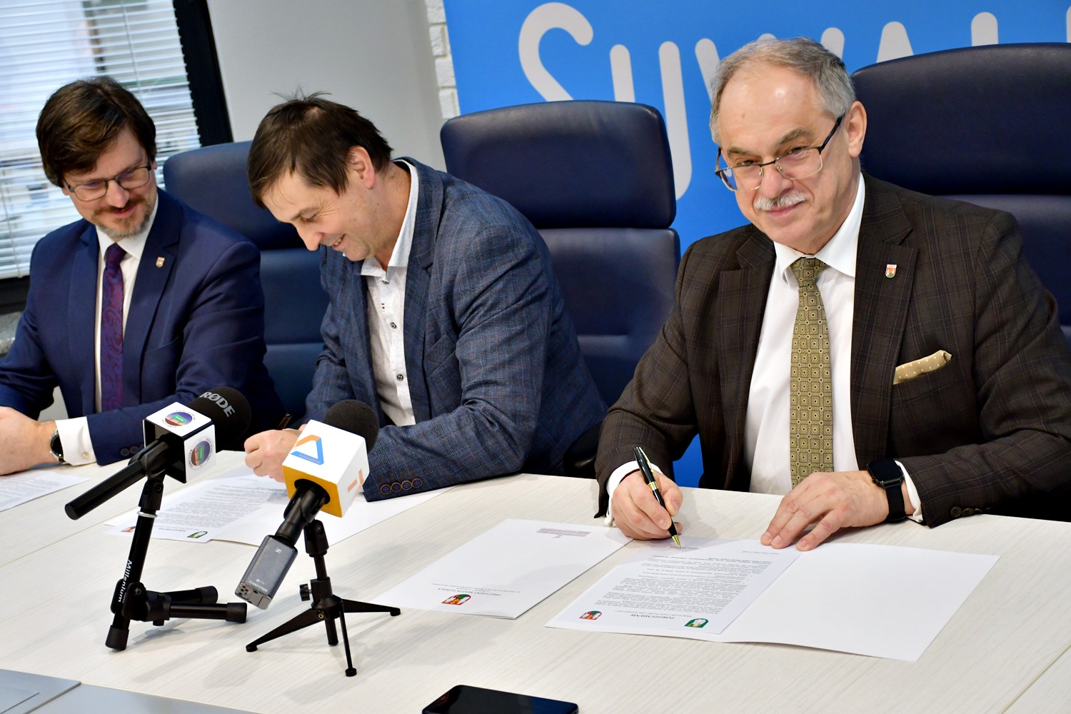 - Uczniowie z gminy korzystają z naszych szkół podstawowych – chociażby ze Szkoły Podstawowej nr 6 czy nr 11. Ponad 300 dzieci z gminy Suwałki uczęszcza do naszych szkół podstawowych, a około 30 dzieci do suwalskich przedszkoli. Dziś podpisujemy umowę, porozumienie, na mocy którego otwieramy nasze miejskie żłobki dla dzieci do lat 3, mających miejsce zamieszkania na terenie gminy Suwałki. Gmina Suwałki, jak wiemy, nie posiada własnego żłobka. My budujemy już czwarty żłobek i z uwagi na obecną sytuację demograficzną — niestety liczba urodzeń spadła i obecnie utrzymuje się na stabilnym poziomie około 450–500 rocznie w mieście, a w gminie jest ich relatywnie mniej — jesteśmy w stanie po wybudowaniu tego czwartego żłobka w pełni zaspokoić potrzeby dzieci urodzonych zarówno w naszym mieście, jak i na terenie gminy Suwałki. Po krótkich rozmowach z gminą, reprezentowaną przez pana wójta, informujemy, że dysponujemy wolnymi miejscami i zachęcamy do korzystania z żłobków miejskich, które funkcjonują w trzech lokalizacjach, a czwarta jest w budowie. Ten nowy żłobek ma powstać i rozpocząć działalność od 1 lipca przyszłego roku. Jesteśmy otwarci na współpracę i cieszę się, że z gminą Suwałki układa się ona bardzo dobrze na wielu płaszczyznach. Jesteśmy dziś silnie powiązani różnymi działaniami miejskimi i gminnymi, wzajemnie współpracujemy i pomagamy sobie — tak właśnie powinny współdziałać sąsiednie samorządy - mówił na konferencji Czesław Renkiewicz.