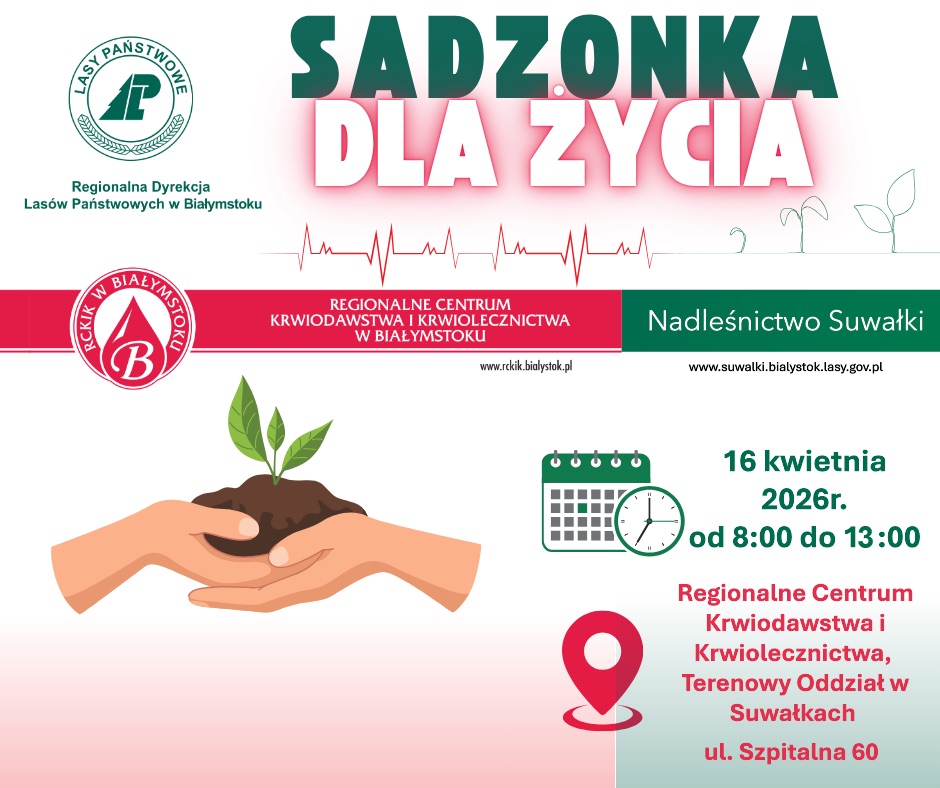 Nadleśnictwo Suwałki wspólnie z Regionalnym Centrum Krwiodawstwa i Krwiolecznictwa zachęcają do udziału w kolejnej edycji akcji "sadzonka dla życia". Celem akcji jest promocja idei honorowego krwiodawstwa. To także okazja do rozmów z leśnikami z Nadleśnictwa Suwałki o roli lasów – gospodarczej, społecznej i ochronnej.