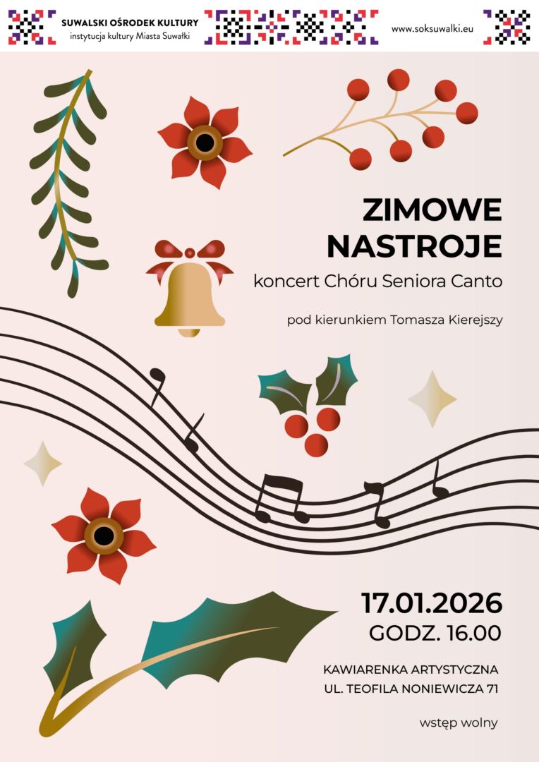 Suwalski Ośrodek Kultury zaprasza 17 stycznia na wyjątkowy koncert „Zimowe nastroje z Chórem Seniora Canto” pod kierunkiem Tomasza Kierejszy. To będzie wieczór pełen ciepłych brzmień, harmonii i muzycznych wspomnień, które idealnie wpisują się w zimową aurę za oknem!