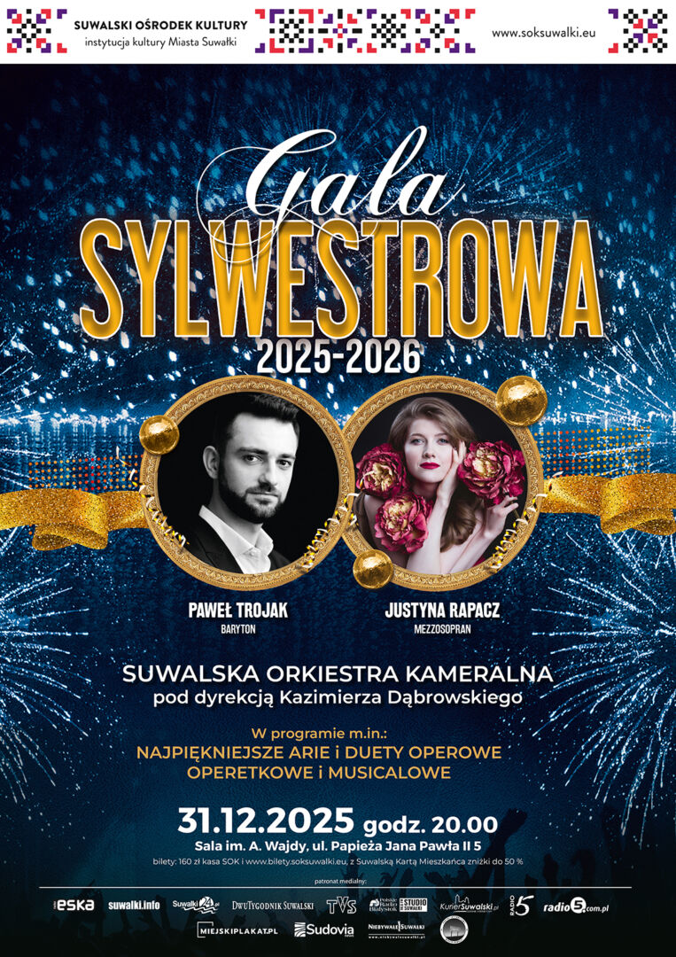 Suwalska Orkiestra Kameralna pod batutą Kazimierza Dąbrowskiego zaprasza na niezwykły Koncert Sylwestrowy, w którym wystąpią znakomici soliści – Justyna Rapacz (mezzosopran) oraz Paweł Trojak (baryton).