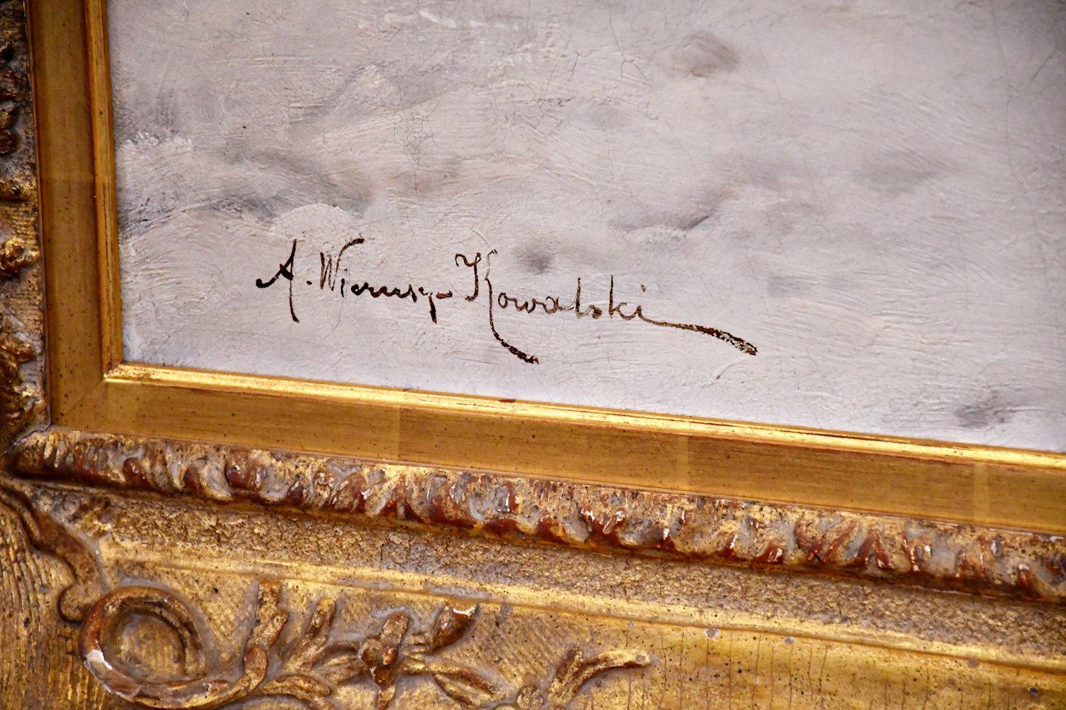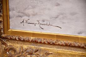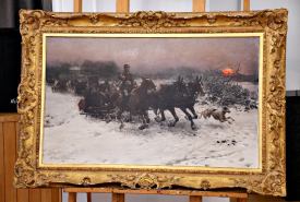 - Nie wiemy, jakie były jego losy — czy wędrował od kolekcjonera do kolekcjonera, czy może przez cały czas pozostawał w jednym miejscu, w jednej rodzinie. W każdym razie w latach dwudziestych trafił do Polski, właśnie do kolekcjonera, który zakupił go w domu aukcyjnym. Ten obraz z jednej strony jest znany, ponieważ był reprodukowany w publikacji wydanej w latach 90. w Niemczech i oczywiście ukazał się także w katalogu aukcji w Polskim Salonie Sztuki. Natomiast nigdy nie był reprodukowany w prasie, co potwierdza tezę, że musiał zostać sprzedany bezpośrednio z pracowni i nie doczekał się innych wersji. To znaczy — istnieje obraz zbliżony tematycznie, przedstawiający kulig wyjeżdżający gdzieś w przestrzeń, zostawiający za sobą wieś lub, jak tutaj, dwór — jednak jest to jeden, jedyny obraz. A jak wiemy, Wierusz lubił wracać do motywów, które zyskały popularność lub spodobały się odbiorcom sztuki, miłośnikom, a także tym, które były prezentowane na wystawach. Lubił je powtarzać, oczywiście przearanżowując wiele elementów. Dzięki temu zawsze zachowywały świeży, nowy wygląd — nie było w nich poczucia powtórzenia. Ten obraz natomiast jest jak gdyby jedyny, co podnosi jego rangę i znaczenie. Jest to dzieło, które powstało w latach 80., uznawanych za najlepszy okres w jego twórczości. Choć później stworzył wiele bardzo pięknych i wyjątkowych obrazów, to właśnie ten czas — od lat 80. do połowy lat 90. — uchodzi za okres szczytowy w jego dorobku artystycznym. Być może dlatego, że najbardziej trafiał wówczas do odbiorców, chociażby poprzez bardzo wierne odtworzenie przedstawianej rzeczywistości. Często słyszy się reakcje w rodzaju: „och, jak pięknie — jak na fotografii”, że wszystko wygląda niemal fotograficznie. Rzeczywiście były to obrazy, które epatowały i urzekały swoją nastrojowością oraz szczególnym urokiem świata, który już minął. Był to świat, który także w tamtym czasie — a z pewnością dla odbiorców zachodnioeuropejskich czy amerykańskich — jawił się jako egzotyczny, nieznany im z codziennego doświadczenia. Odmienność strojów, a także w pewnym stopniu krajobrazu, dodatkowo potęgowała to poczucie egzotyki. Dlatego dla nas ten obraz będzie jednym z czołowych dzieł w naszej kolekcji - przekazała Eliza Ptaszyńska.