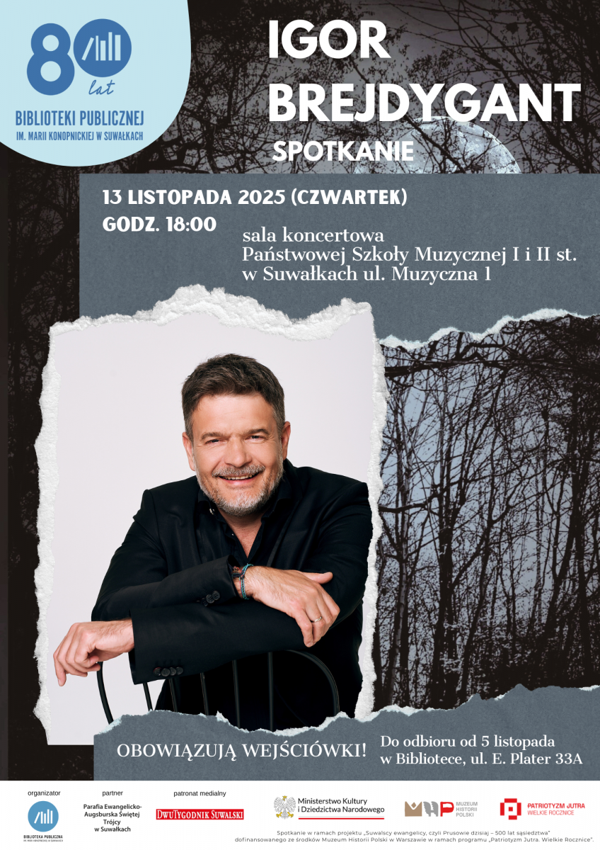 Z okazji jubileuszu 80-lecia Biblioteka Publiczna im. Marii Konopnickiej w Suwałkach zaprasza na spotkanie z autorem poczytnych książek Igorem Brejdygantem. Obowiązują bezpłatne wejściówki.