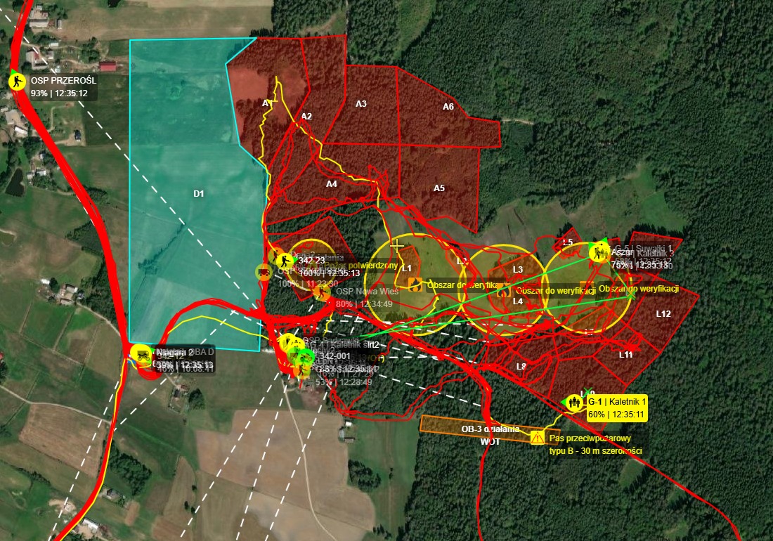 Teren akcji został podzielony na odcinki bojowe, co pozwoliło na sprawne kierowanie działaniami gaśniczymi oraz lepszą koordynację pracy poszczególnych zastępów. Do zarządzania siłami i środkami wykorzystano system wspomagania dowodzenia SIRON oraz samochód dowodzenia i łączności (SDŁ), co umożliwiło bieżącą analizę sytuacji i szybkie podejmowanie decyzji. W trakcie ćwiczeń przeprowadzono również epizod medyczny. Jeden z żołnierzy, prowadzący działania gaśnicze przy użyciu hydronetki, doznał urazu nogi. Natychmiast wdrożono procedury ratownicze – poszkodowanemu udzielono kwalifikowanej pierwszej pomocy, a następnie przeprowadzono jego ewakuację z terenu działań.