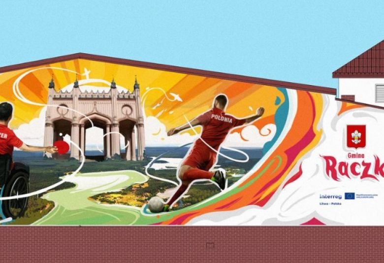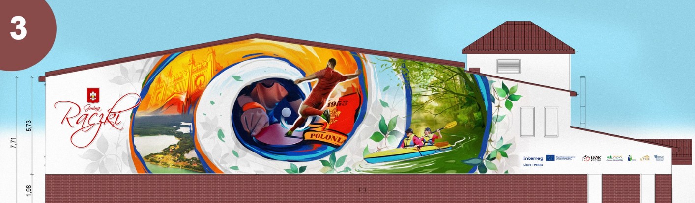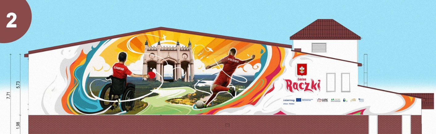 2. „Raczki: Gramy do jednej bramki” Motywem przewodnim jest aktywność sportowa jako siła łącząca ludzi, bez względu na stopień ich sprawności. Kompozycja podkreśla sportowy charakter gminy i jej sukcesy. W centrum znajduje się symboliczny Pałac Paca, otoczony scenami inspirowanymi osiągnięciami lokalnych zawodników.