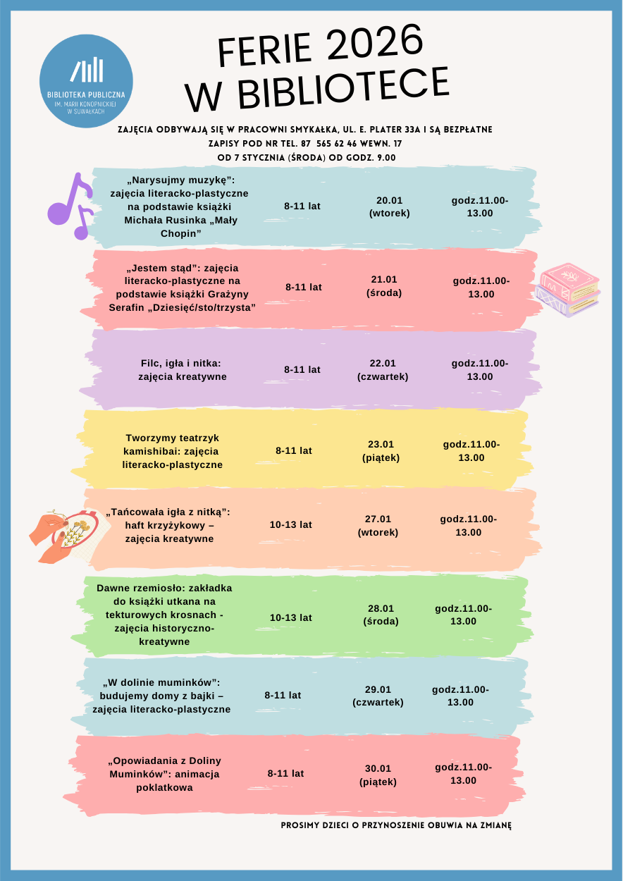 Zajęcia odbywają się w Pracowni „Smykałka", ul. E. Plater 33A w godzinach 11:00 – 13:00 i są bezpłatne. Obowiązują zapisy telefoniczne pod nr: 87 565 62 46 wewn. 17, od 7 stycznia (środa) od godz. 9.00. Prosimy dzieci o przynoszenie ze sobą obuwia na zmianę. Po zapisaniu dziecka na zajęcia, prosimy o wypełnienie zgody (do pobrania na stronie Biblioteki) i dostarczenie najpóźniej w pierwszym dniu zajęć.