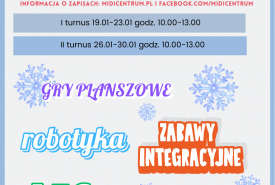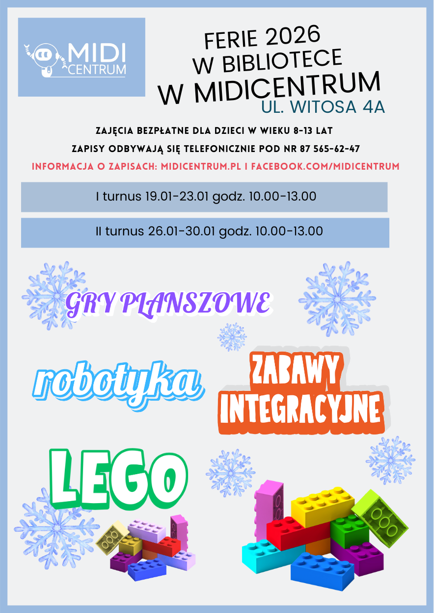 Do MIDICENTRUM – Kreatywnego Ośrodka Nauki i Technologii ul. Witosa 4A zapraszamy dzieci w wieku 8-13 lat na interdyscyplinarne zajęcia podczas ferii zimowych. Zajęcia odbędą się w formie turnusów – od poniedziałku do piątku, w godzinach 10.00–13.00. Obowiązują zapisy telefoniczne pod nr: 87 565 62 47, od 7 stycznia (środa) od godz. 9.00.