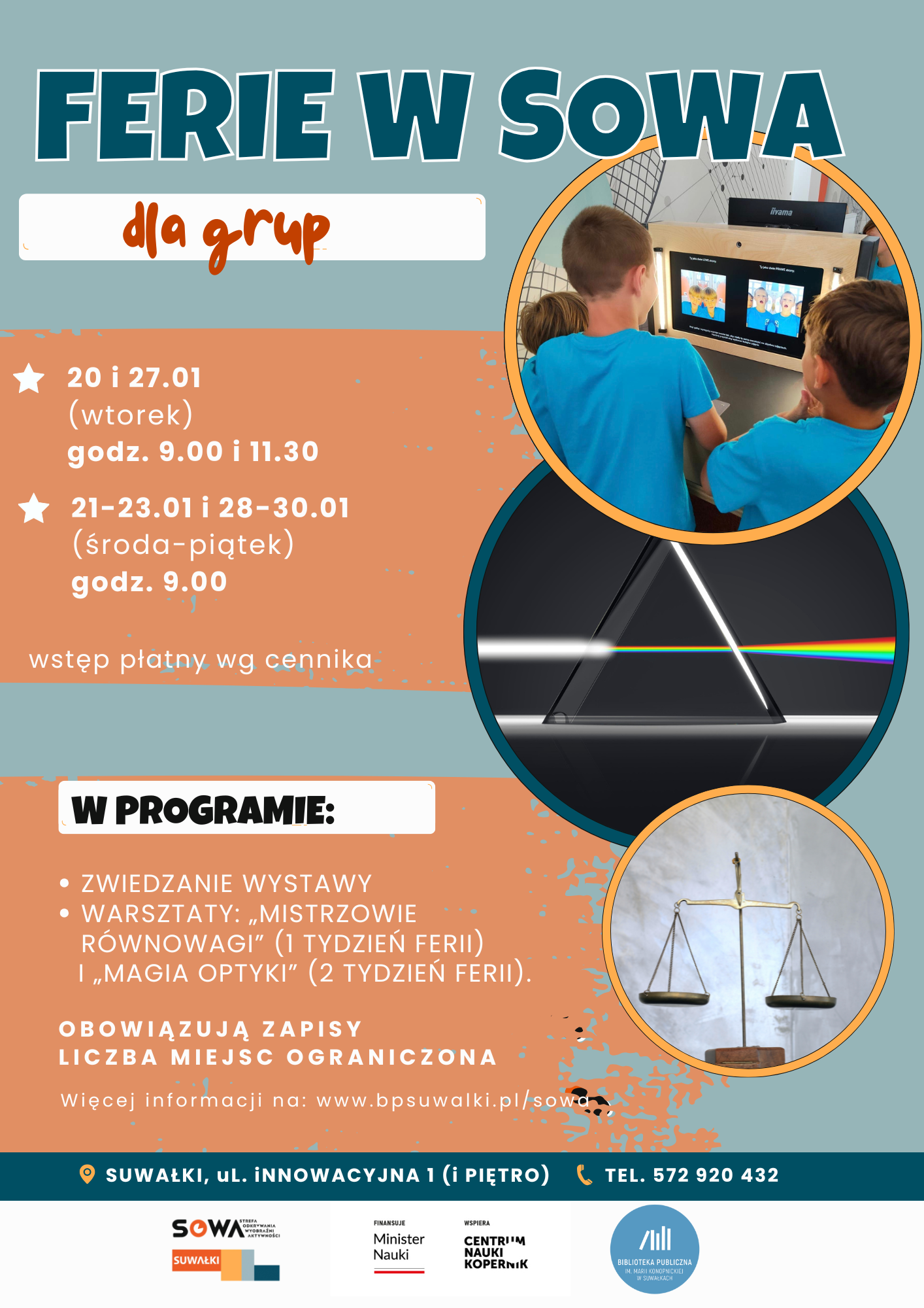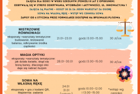 „Zimowa zabawa z Nauką: Równowaga i Światło" Gotowi na największą zimową przygodę? Ferie w SOWA Suwałki to czas, gdzie nauka zamienia się w zabawę, a każdy uczestnik staje się prawdziwym odkrywcą! W trakcie ferii czekają na Was: