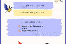 Podczas turnusu poznamy ptaki zimujące w Polsce i zbudujemy karmnik. Prosimy dzieci o przynoszenie ze sobą obuwia na zmianę.