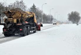 - 4 samochody ciężarowe (wyposażone w pług i posypywarkę) pracują przy pługowaniu i zwalczaniu śliskości na drogach o standardach II, III, IV i V.
