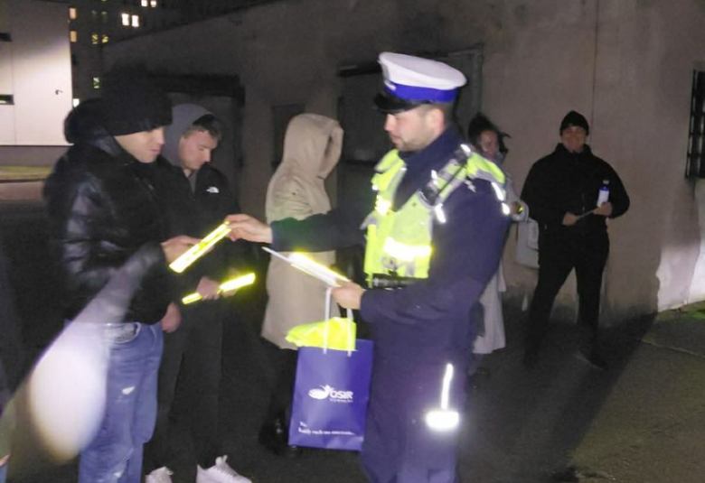 Studenci z Suwałk otrzymali od mundurowych odblaski i mogli przekonać się, że pieszy wyposażony w element odblaskowy jest widoczny z dużo większej odległości, niż ten bez odblasków.