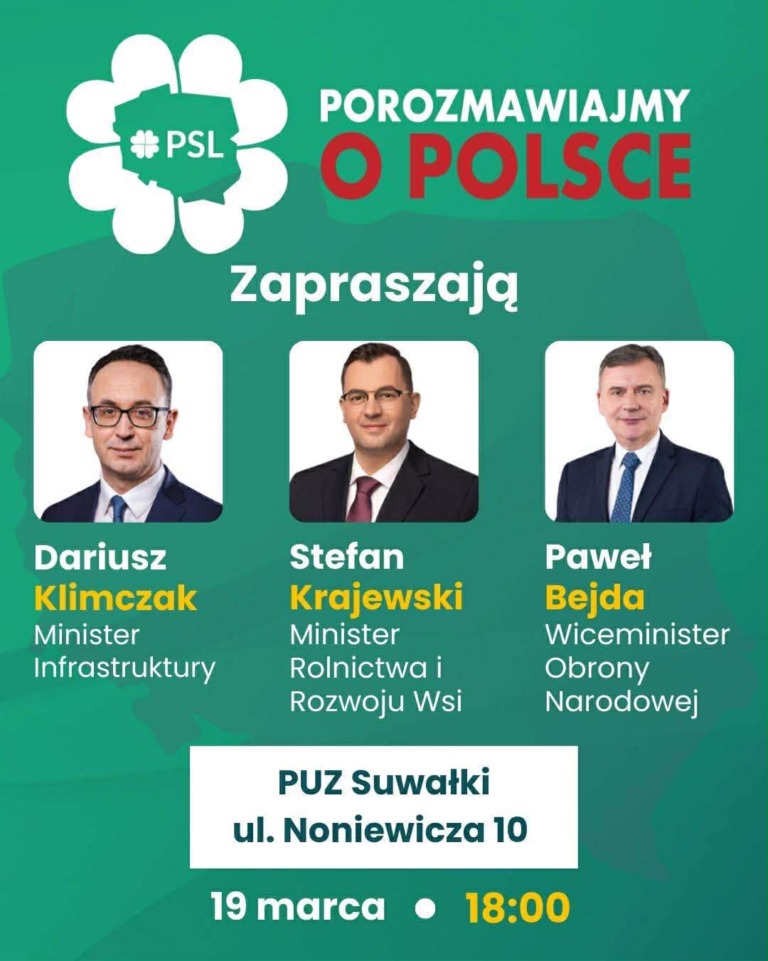 Otwarte spotkanie mieszkańców Suwałk i województwa podlaskiego z przedstawicielami rządu RP odbędzie się w czwartek 19. marca w Państwowej Uczelni Zawodowej. Gośćmi będą Dariusz Klimczak, Minister Infrastruktury, Stefan Krajewski, Minister Rolnictwa i Rozwoju Wsi, Paweł Bejda, Wiceminister Obrony Narodowej.