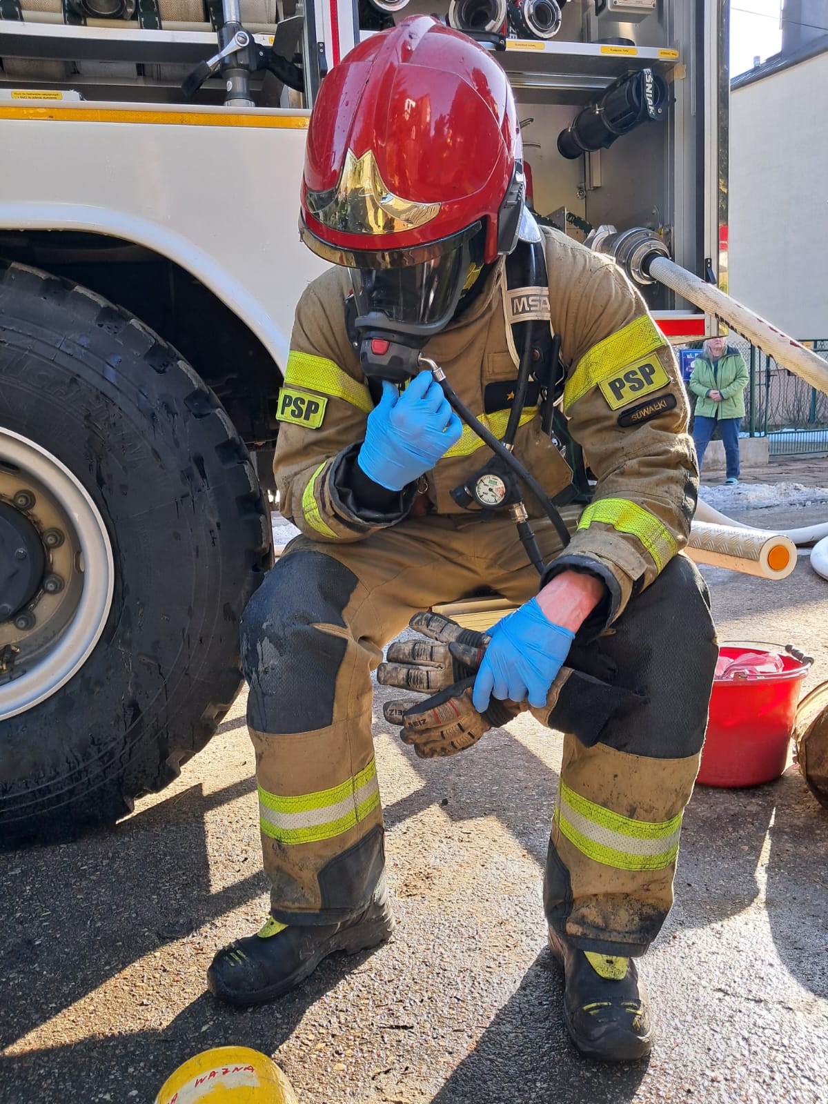 Po przybyciu zastępów straży pożarnej KM PSP w Suwałkach zastano w pełni rozwinięty pożar poddasza budynku jednorodzinnego o powierzchni około 80 m². Z budynku wydobywał się gęsty dym oraz widoczne były płomienie. Przed przybyciem strażaków na miejsce dotarł patrol Policji, który pomógł czterem domownikom bezpiecznie opuścić budynek. Były to osoby w wieku 65, 65, 32 oraz 96 lat. Najstarsza z nich została ewakuowana na wózku inwalidzkim. Wszystkie osoby zostały przebadane przez zespół ratownictwa medycznego i nie wymagały hospitalizacji.
