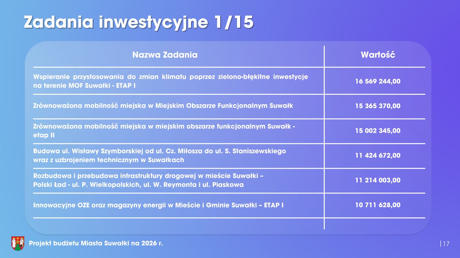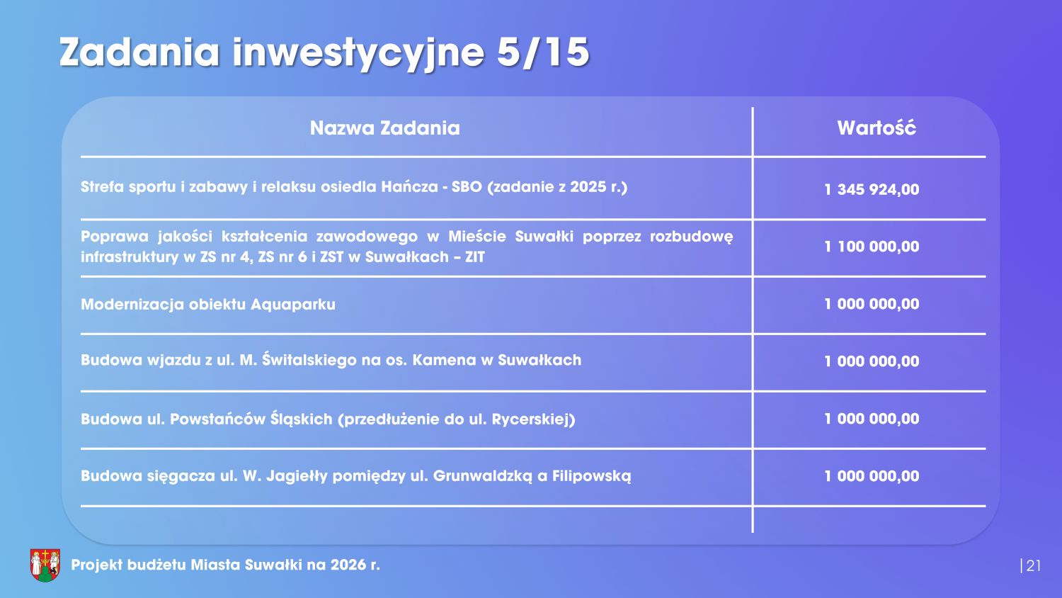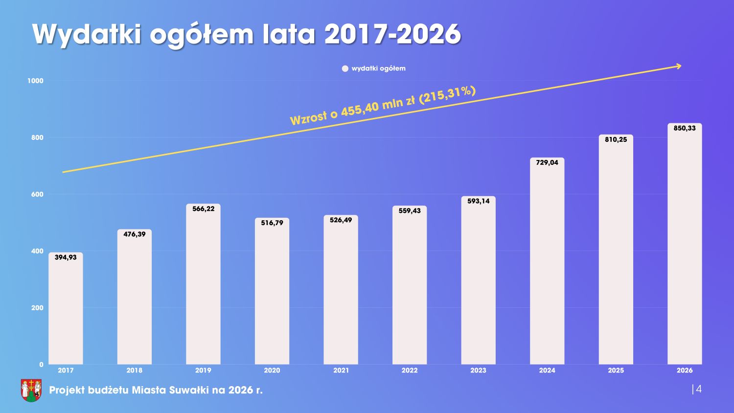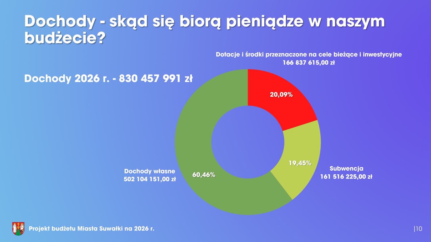 Miasto Suwałki zaprezentowało projekt budżetu na 2026 rok, który wyznacza kierunki finansowe i inwestycyjne na najbliższe 12 miesięcy. Zgodnie z założeniami, dochody wyniosą 830 457 991 zł, natomiast wydatki osiągną poziom 850 327 407 zł. Na realizację inwestycji przewidziano 169 775 482 zł, co potwierdza utrzymanie proinwestycyjnego charakteru miejskich finansów.