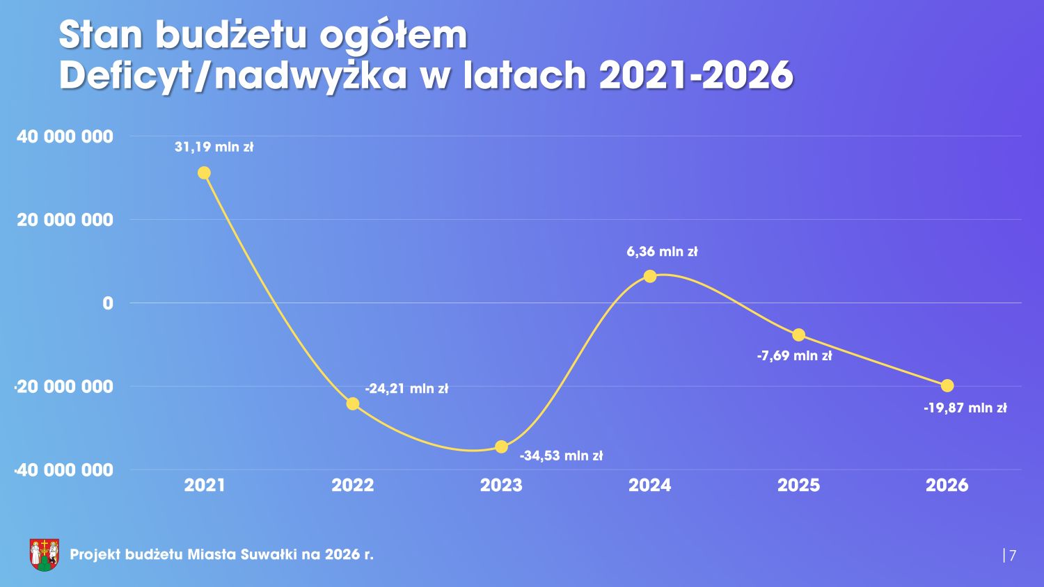 Plan na 2026 rok zakłada deficyt w wysokości 19 869 416 zł, który w całości ma zostać pokryty z wolnych środków. Jednocześnie miasto prognozuje nadwyżkę operacyjną na poziomie 55,67 mln zł, co świadczy o stabilnej kondycji budżetu w zakresie bieżących dochodów i wydatków.