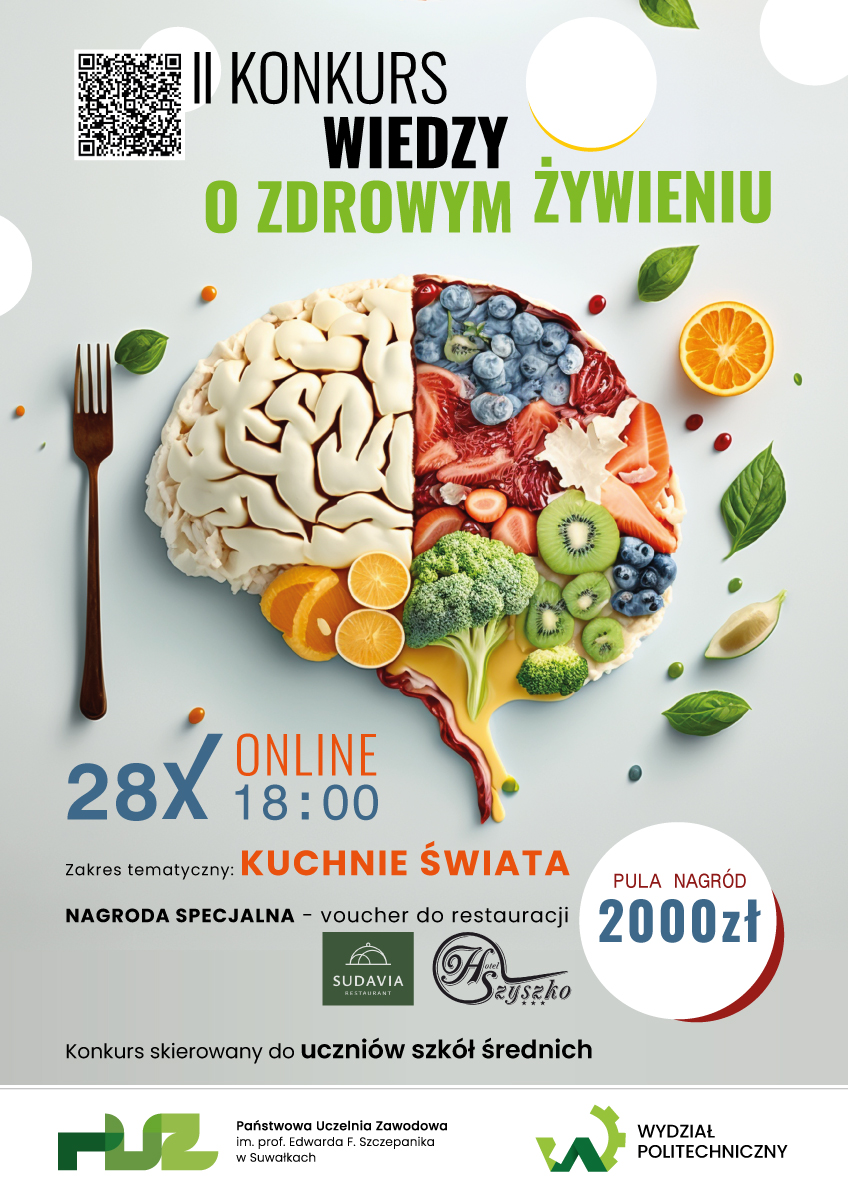 II KONKURS WIEDZY O ZDROWYM ŻYWIENIU, skierowany do uczniów szkół średnich. W puli nagród: 2000 zł + nagroda specjalna: voucher do Restauracji Sudavia (w Hotelu Szyszko) - partnera konkursu. Tegoroczna edycja poświęcona jest kuchniom świata.