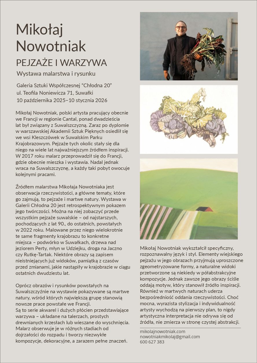 Suwalski Ośrodek Kultury zaprasza na wystawę malarstwa Mikołaja Nowotniaka – artysty i architekta wnętrz, którego pejzaże, akwarele i martwe natury opowiadają o wrażliwości na światło, przestrzeń i piękno codzienności.