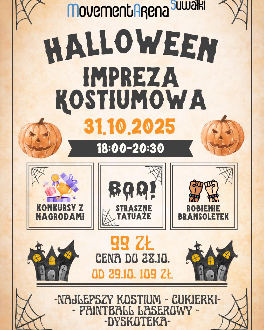 • Haloweenowa impreza kostiumowa – coroczne wydarzenie, w którym bierze udział ok 100 dzieci z regionu: kostiumy, zabawa na wszystkich strefach, zadania, konkursy, angrody i całośc zakończona dyskoteką – 31 października (ostatnie wolne miejsca czekają). Szczegóły: https://www.facebook.com/movementarenasuwalki