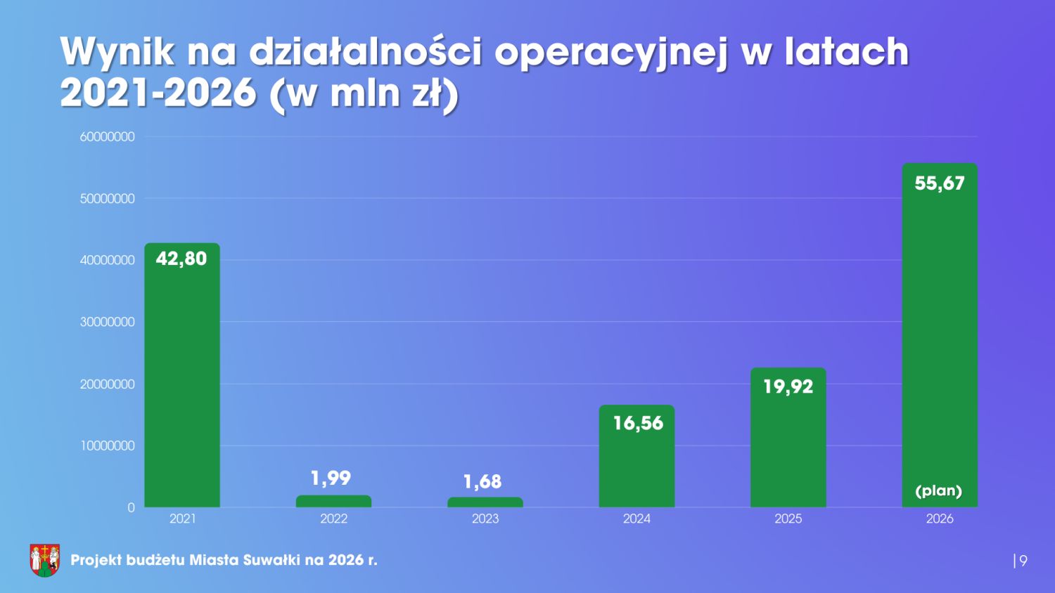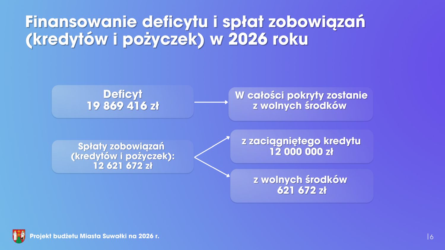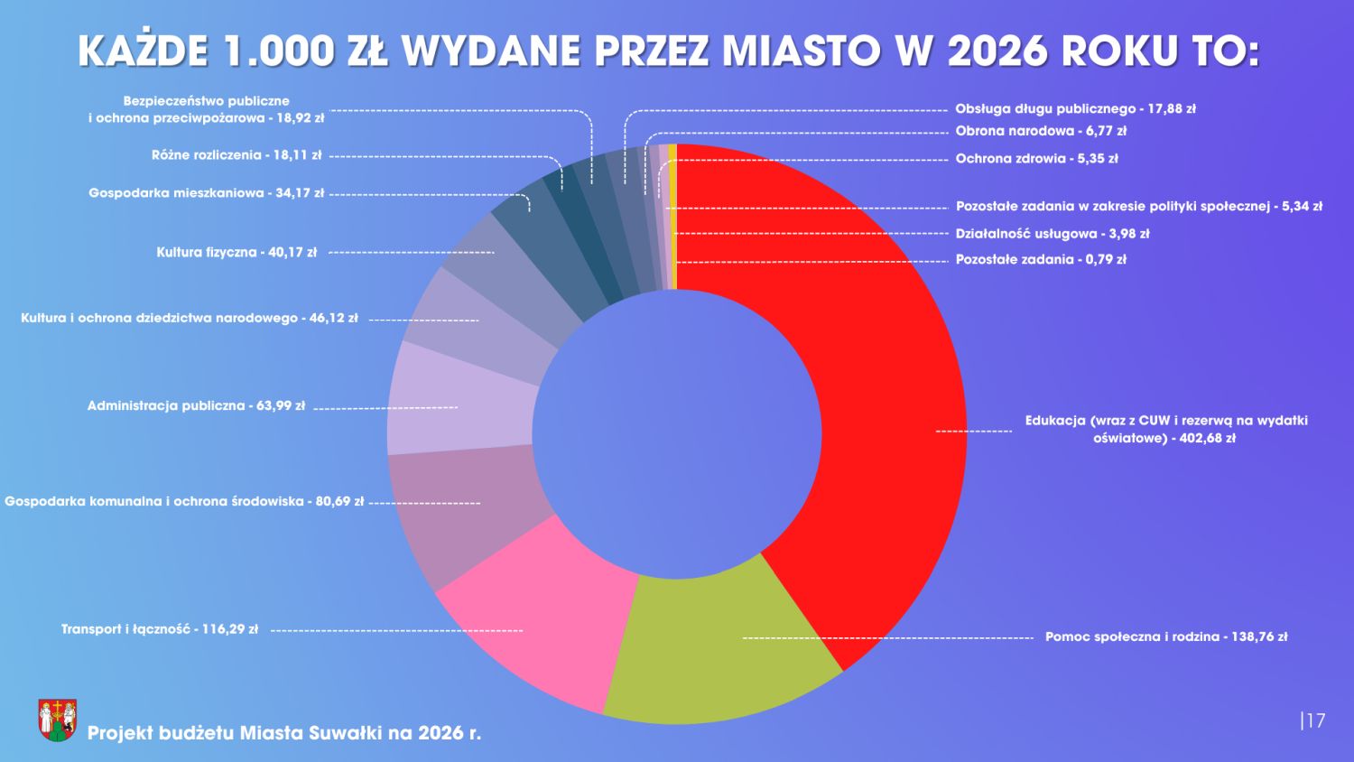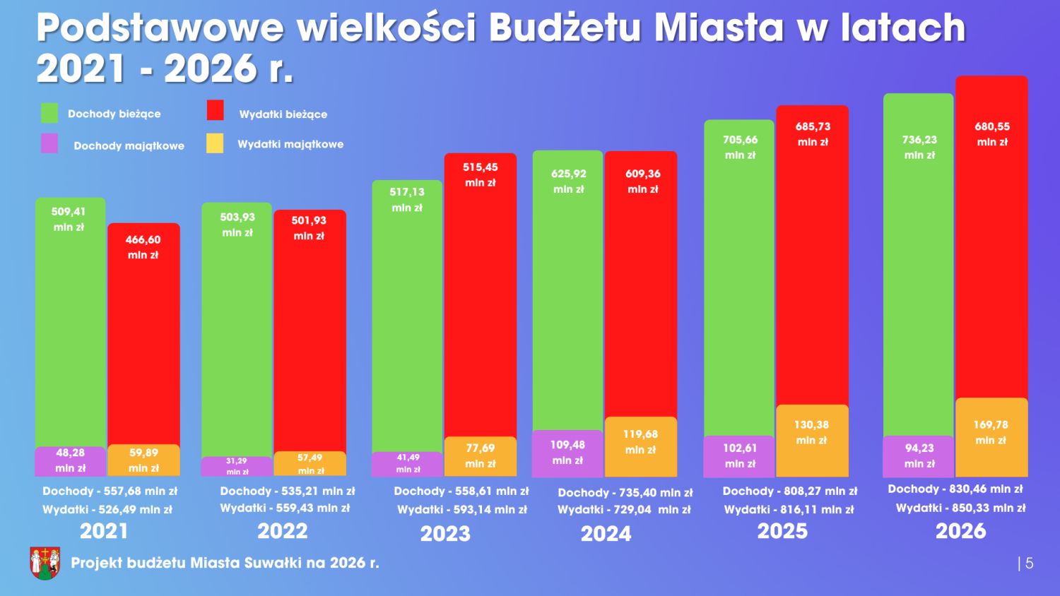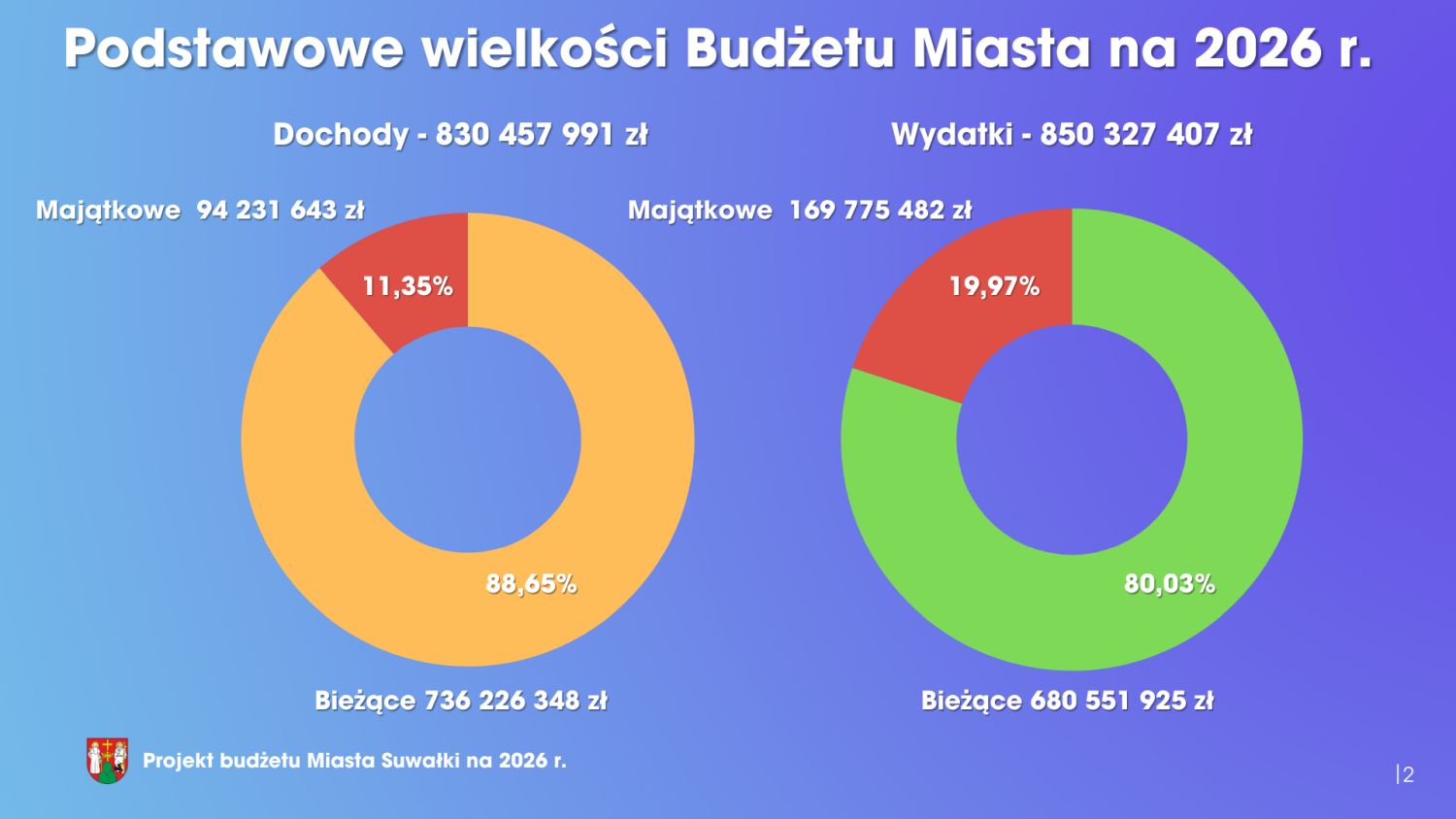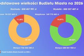- Budżet miasta na 2026 rok jest budżetem rekordowym. Podkreślmy to wyraźnie – rekordowym. Dochody miasta przekraczają 830 milionów złotych. To są fakty. Wydatki natomiast wyniosą 850 milionów złotych. Co szczególnie istotne, dochody bieżące są wyższe od wydatków bieżących o ponad 55,5 miliona złotych, co stanowi solidny fundament stabilności finansowej miasta. Należy również podkreślić, że planowany deficyt zostanie w całości pokryty wypracowanymi wolnymi środkami, bez konieczności zaciągania kredytów, co potwierdza odpowiedzialne i długofalowe zarządzanie finansami miasta Suwałki.