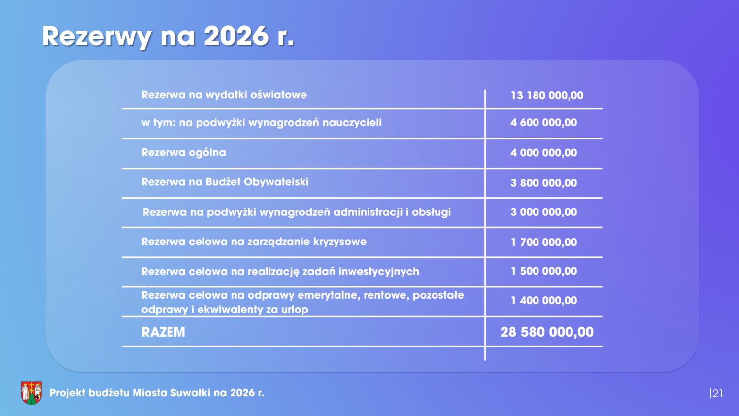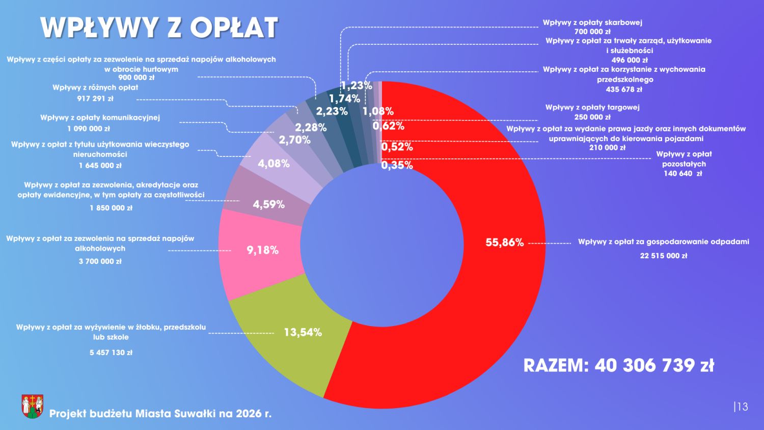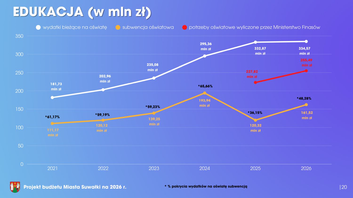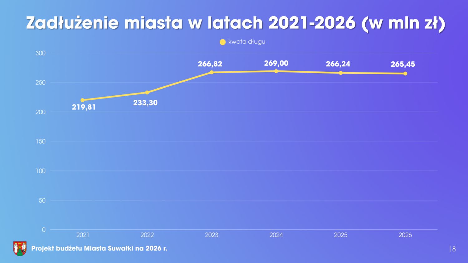Rozpatrzenie projektu uchwały w sprawie budżetu miasta na 2026 rok to główny punkt sesji Rady Miasta w Suwałkach, która miała miejsce w poniedziałek w miejskim Ratuszu. Budżet Suwałk na 2026 rok wynosi 830 milionów złotych po stronie dochodów oraz 850 milionów złotych po stronie wydatków. Blisko 170 mln zł przeznaczonych zostanie na inwestycje, a ponad 18 mln zł na podwyżki dla pracowników miejskich i nauczycieli. Ponad 19 mln zł wyniesie deficyt, jednak prognozowana jest też nadwyżka ponad 55 mln zł na działalności bieżącej miasta. Zadłużenie miasta to kwota ponad 265 mln zł. Szczegółowe informacje dostępne są na poniższej prezentacji.