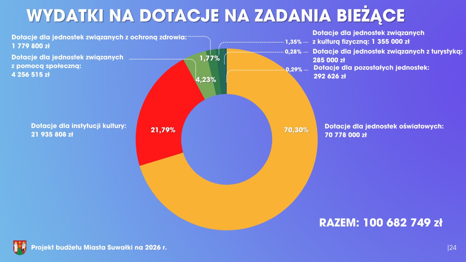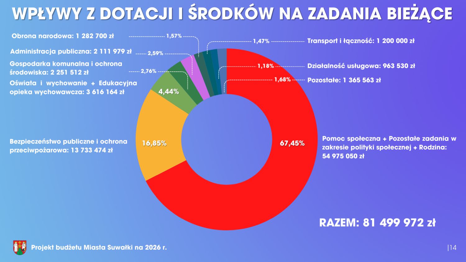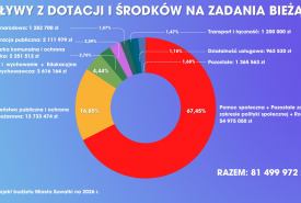W budżecie na 2026 rok konsekwentnie utrzymujemy obszary, które od lat traktujemy jako priorytetowe. Są to oświata, pomoc społeczna oraz wzrost wynagrodzeń. Na oświatę przeznaczamy 335 milionów złotych, co stanowi niemal 50% całego budżetu miasta. Na pomoc społeczną i pomoc rodzinie przeznaczamy ponad 113 milionów złotych, czyli prawie 17% budżetu miasta. Znaczące środki przeznaczamy również na sport, wspierając zarówno sport dzieci i młodzieży, działalność klubów sportowych, jak i rozwój infrastruktury sportowej. Nie zapominamy także o kulturze, zabezpieczając finansowanie miejskich instytucji kultury, wydarzeń kulturalnych oraz inicjatyw budujących tożsamość i aktywność lokalnej społeczności. Na podwyżki wynagrodzeń dla pracowników administracji i obsługi oraz nauczycieli zabezpieczyliśmy 10 milionów złotych. Można powiedzieć, że kwota ta nie jest wystarczająca, jednak obraliśmy właściwy kierunek. Jest to wyraźny sygnał, że inwestowanie w mieszkańców traktujemy jako klucz do dalszego rozwoju naszego miasta.