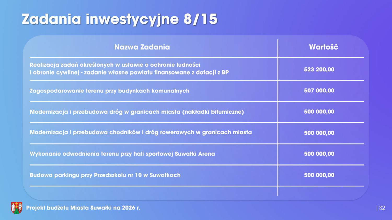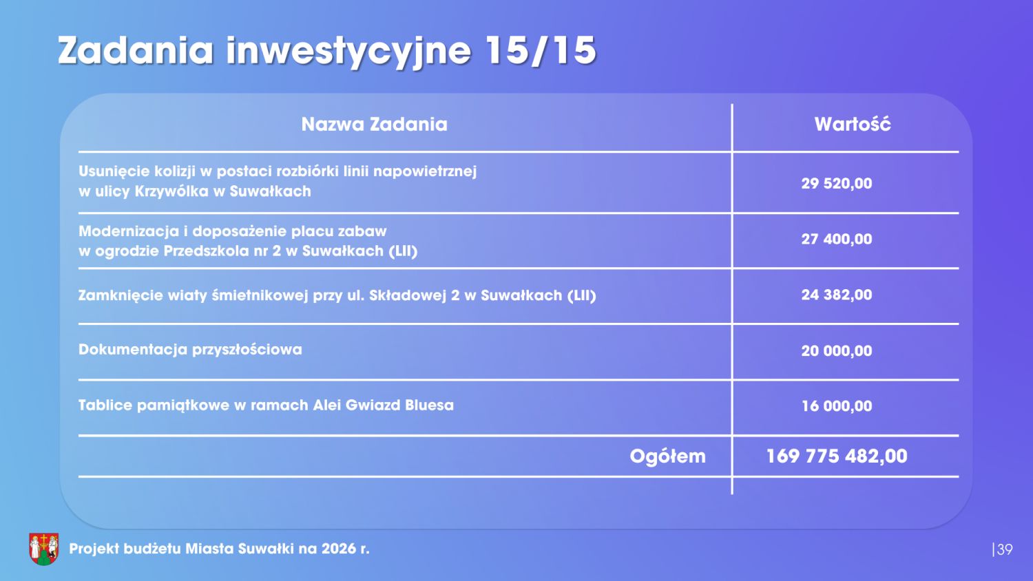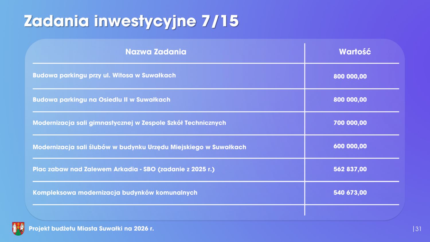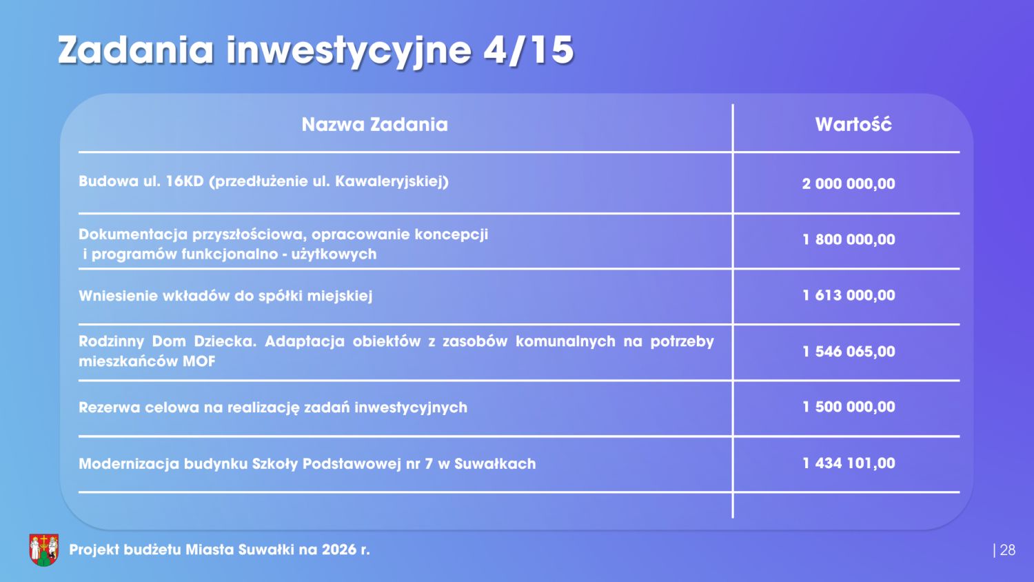Istotnym elementem budżetu jest również program inwestycyjny. W 2026 roku nakłady inwestycyjne wyniosą blisko 170 milionów złotych. Warto jednak zaznaczyć, że ponad połowa tej kwoty pochodzi z dofinansowań zewnętrznych – jest to 85,3 miliona złotych. Podsumowując, przedłożony projekt budżetu miasta Suwałki na 2026 rok w sposób kompleksowy odpowiada na bieżące potrzeby mieszkańców, realizuje cele rozwojowe oraz gwarantuje stabilność finansową samorządu. Ten budżet wyznacza bardzo dobre kierunki rozwoju. Dlatego Klub Radnych „Razem dla Suwałk” z pełnym przekonaniem popiera projekt budżetu i będzie głosował za jego przyjęciem.