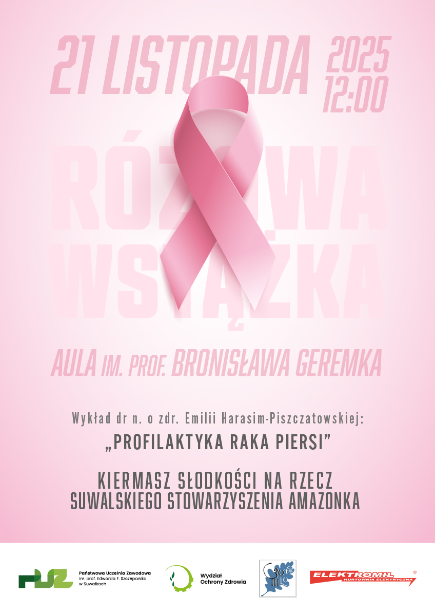Wykład o profilaktyce raka piersi – wiedza, która może uratować życie (poprowadzi dr n. o zdr. Emilia Harasim-Piszczatowska, Dziekan Wydziału Ochrony Zdrowia).